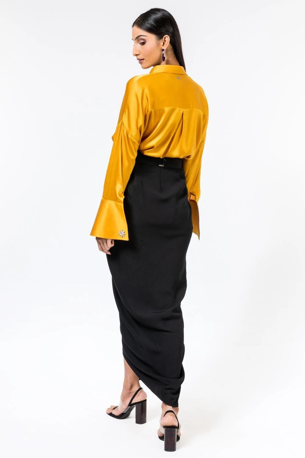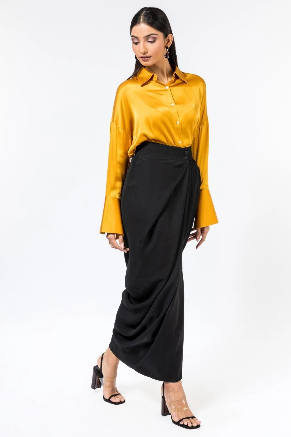 This black drape skirt will fetch you a sleek & sophisticated look with its glove fit. It is cut in micro poly with wrap detailing on the side. You can style it with a matching black top from the collection.