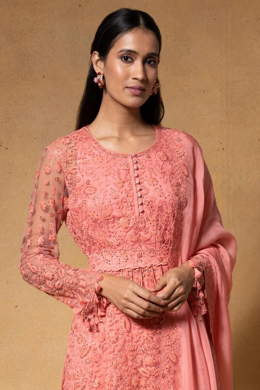 This sharara set will see you through all kinds of celebrations, this wedding season. Crafted in georgette, this set features a floral embellished kurta with a crop top, sharara, belt & dupatta. Add a pair of statement earrings to complete the look.