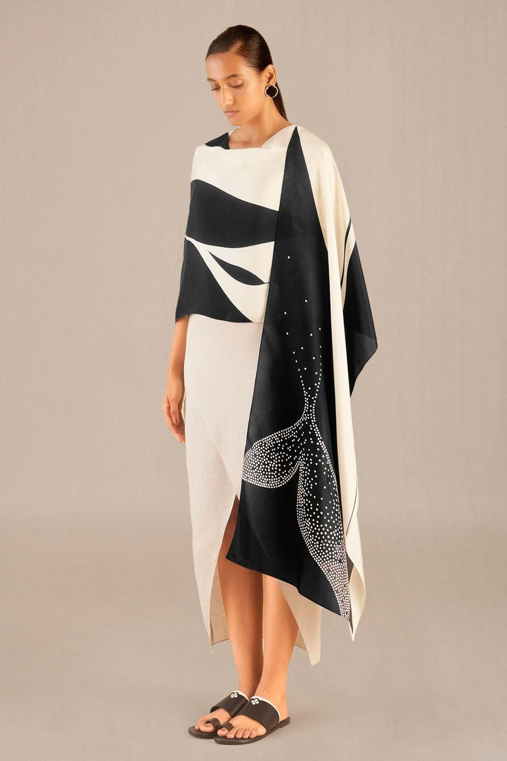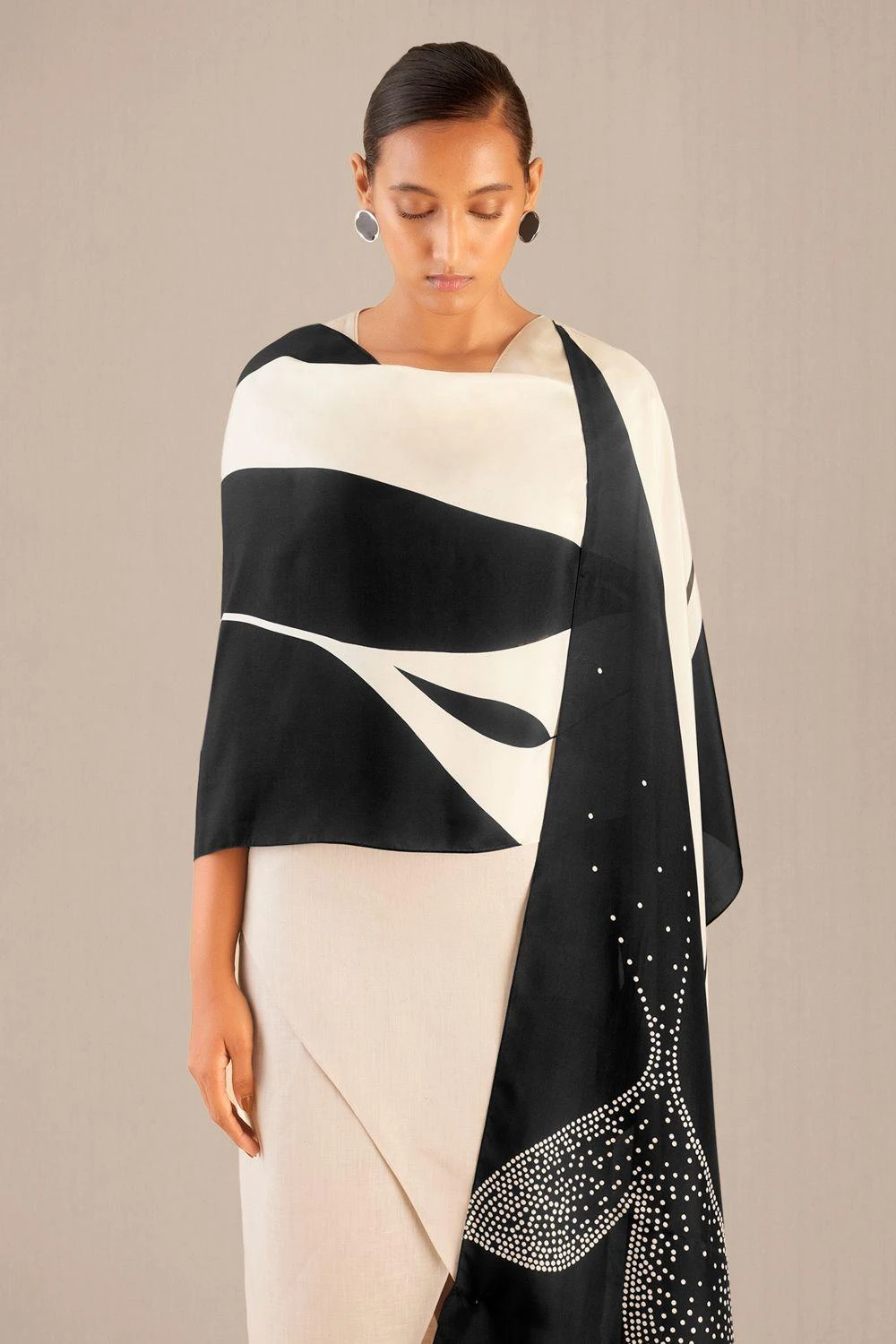 Wrap yourself in the elegance of soft silk and fine prints with this Black and Ivory Scarf. Its flowy design adds a playful charm to your ensemble.