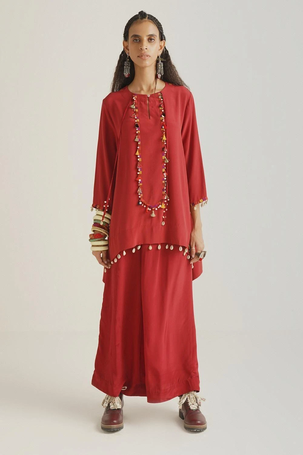 Set in a natural crepe fabric this sindoor coloured shirt tunic & palazzo set is perfect for intimate festive occasions. It is highlighted with delicate embroidery details on the neckline & hem. Style this looks with a statement clutch.