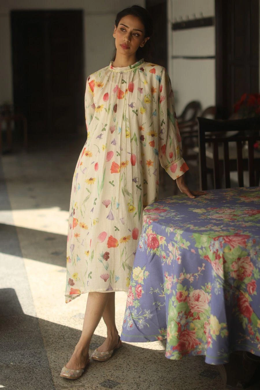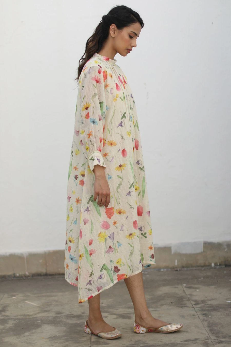 The perfect amalgamation of style & comfort, this dress is perfect for a day out. Crafted in kota & cotton, this hand drawn watercolour printed dress opens up with flirty pleats and comes with a cotton slip.
