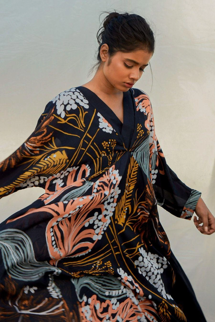 The perfect amalgamation of style and comfort, this kaftan is perfect for a day out. Crafted in muslin, this set features an abstarct printed V-neck kaftan & a slip. Add a pair of dangler earrings to complete the look.