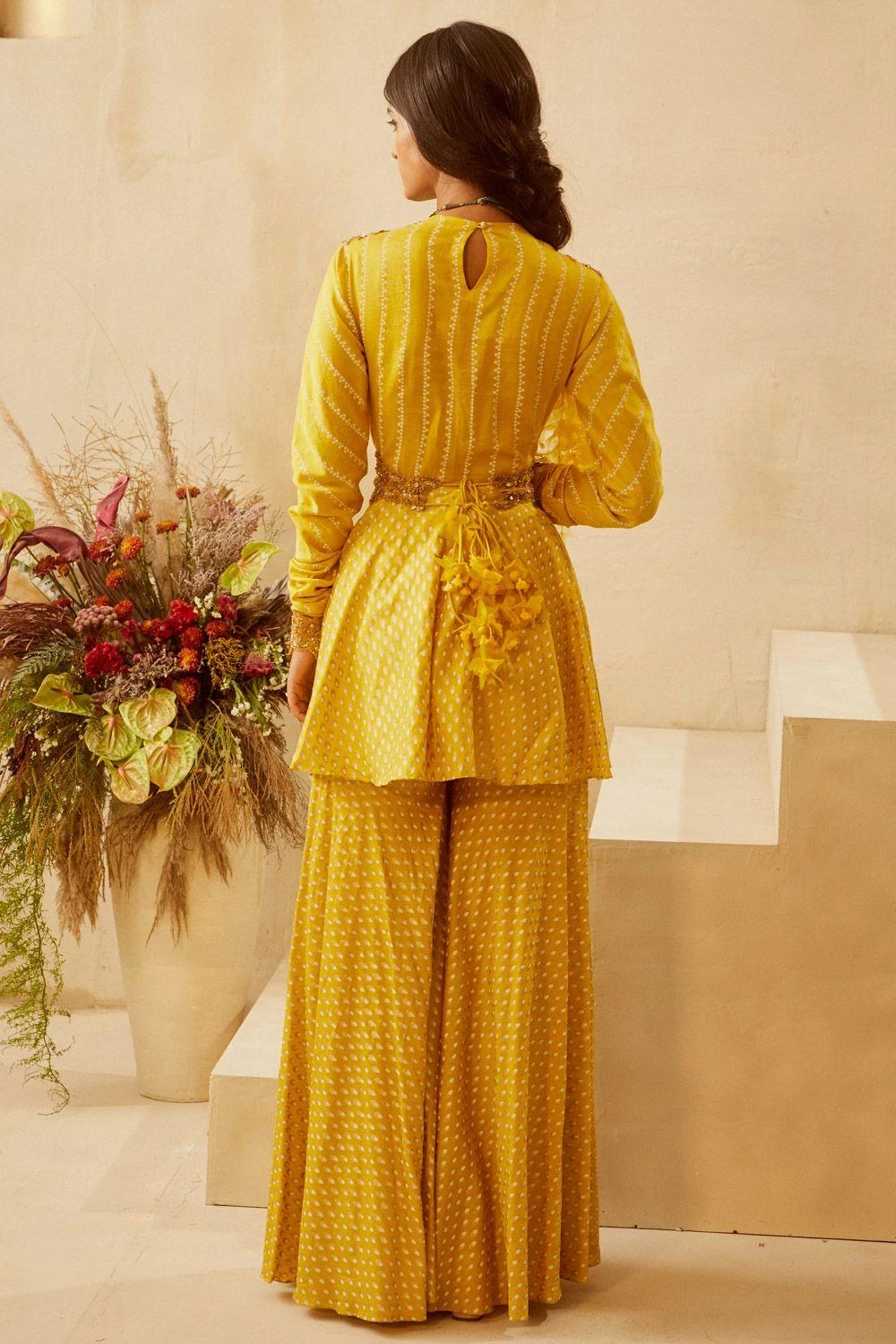 Give a modern & playful touch to your festive closet with this yellow sharara set. It features a chanderi peplum top embroidered with zardosi, tilla & sequin. It is paired with bindu print sharara pants and a statement belt.