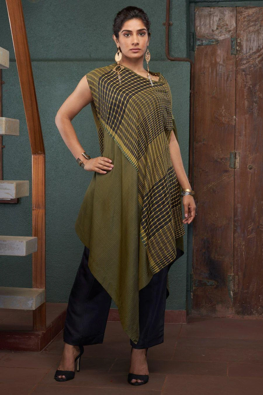The perfect amalgamation of style and comfort, this kurta set is perfect for a day out. Crafted in viscose linen & silk, this set features an asymmetric kurta paired with an inner slip and straight fit pants.