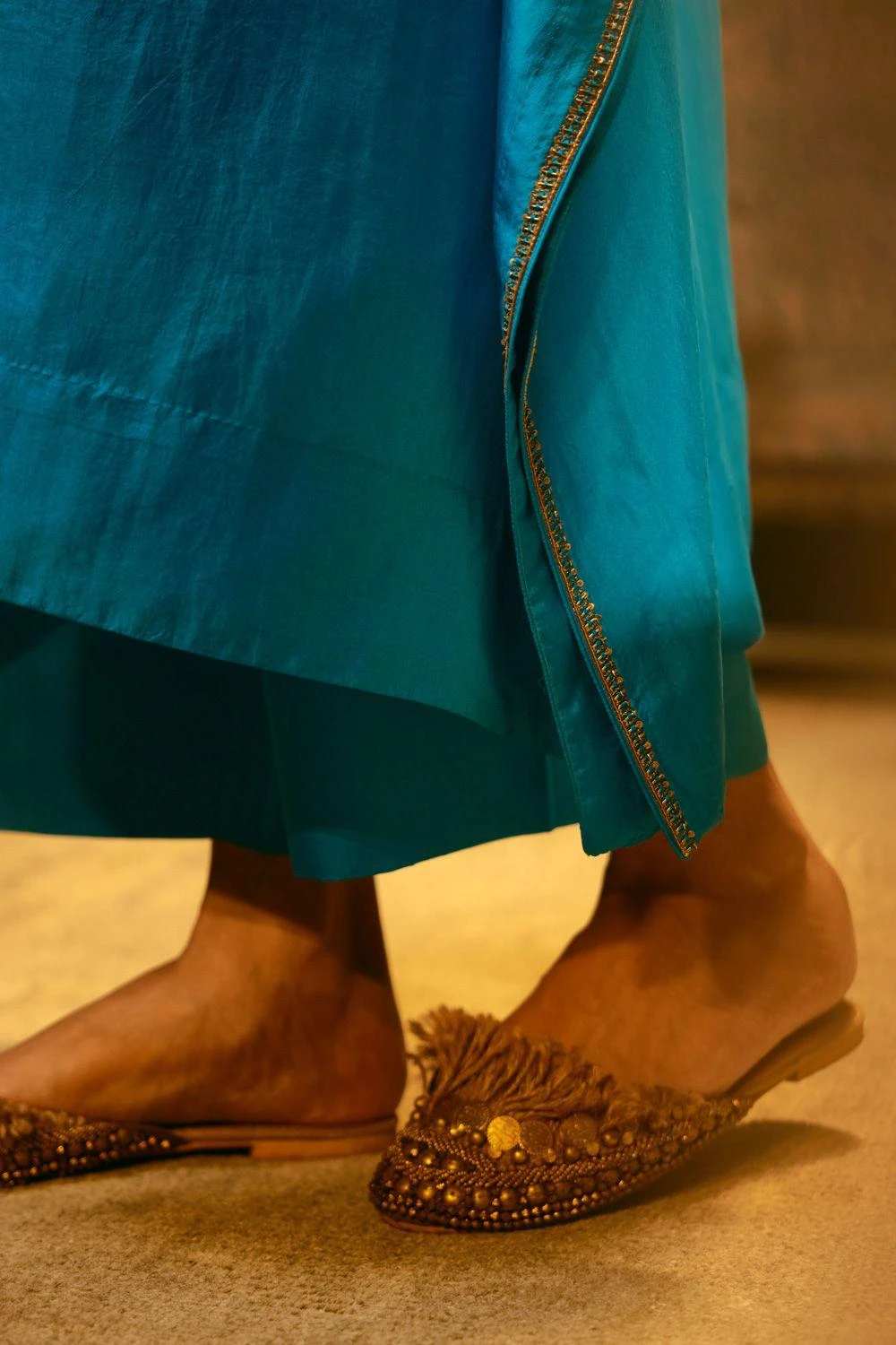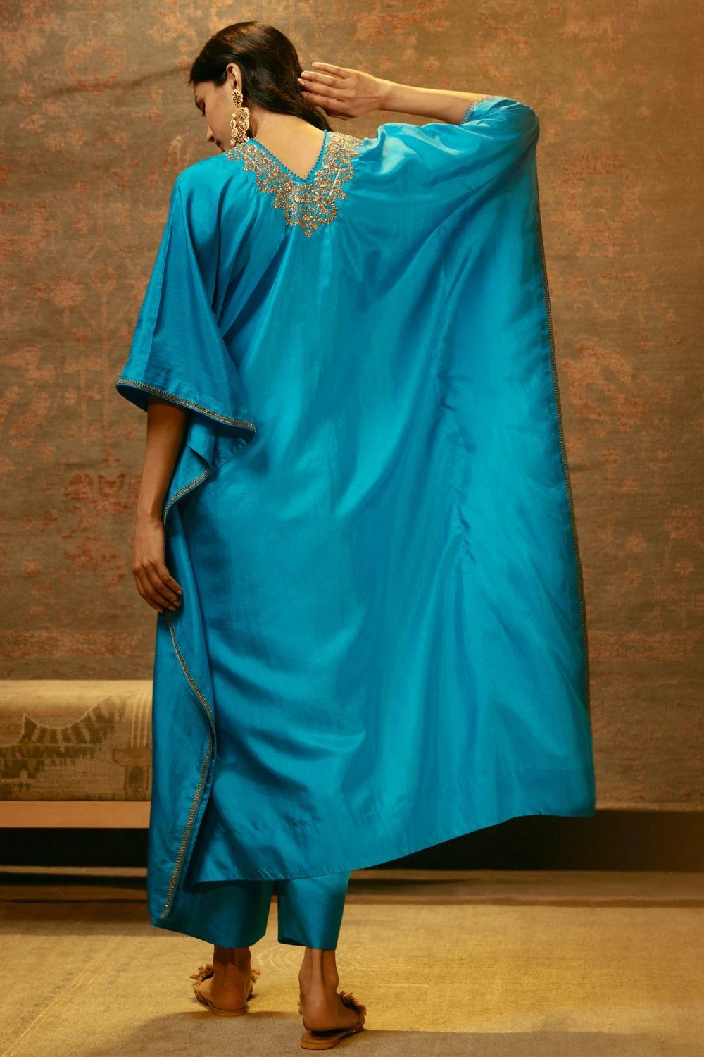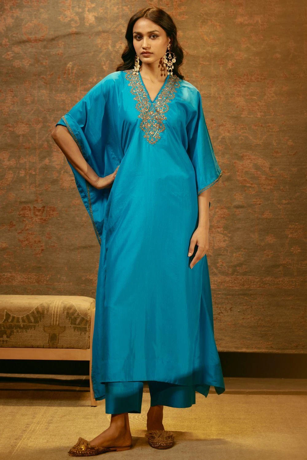 Immerse yourself in elegance with this hand embellished kaftan set. Intricate craftsmanship meets contemporary style, making this ensemble a captivating choice for any occasion.