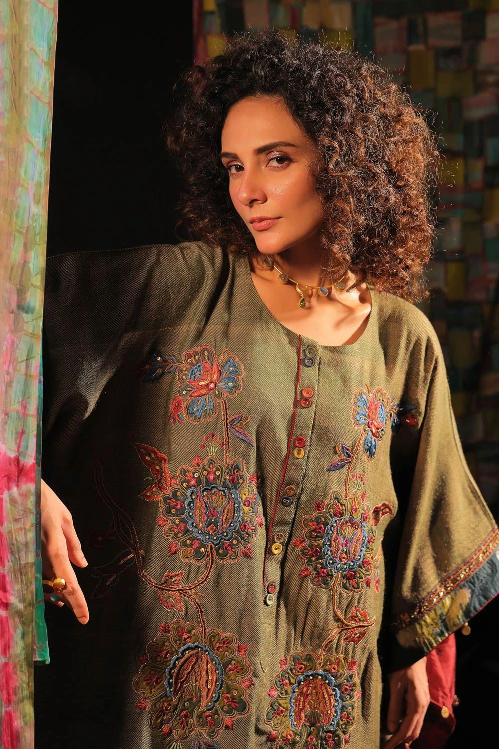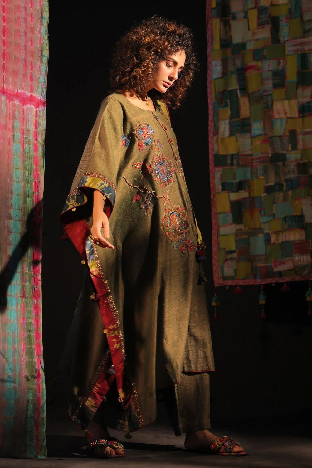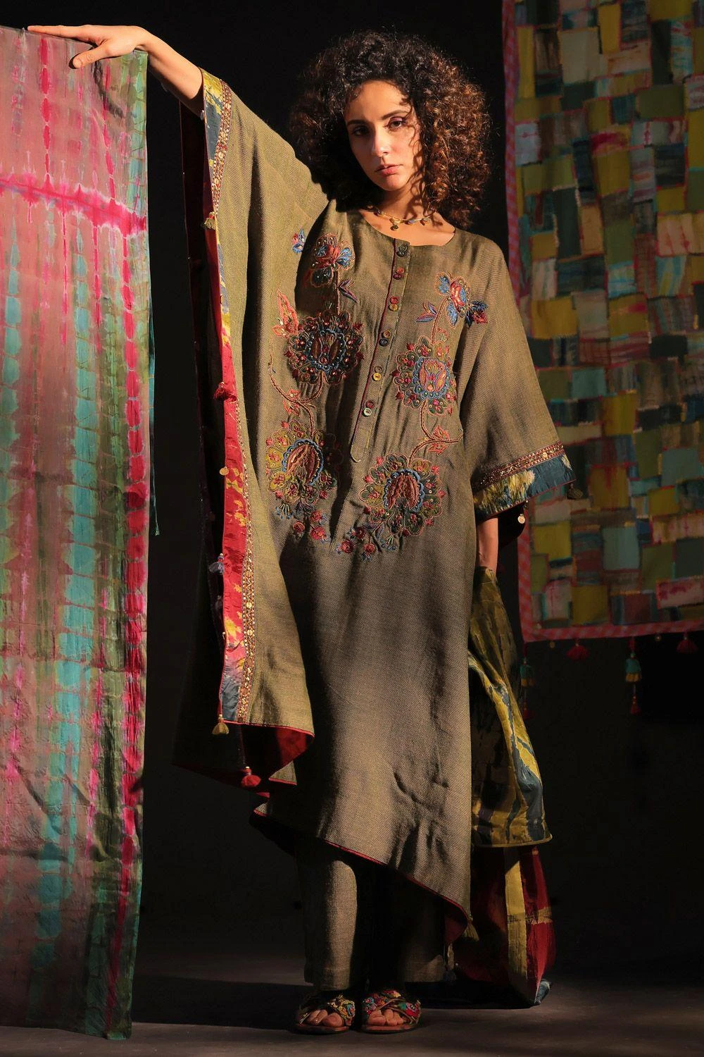 Elevate your style with this embellished kaftan set paired with a Tie-Dye Scarf. This ensemble seamlessly blends fashion and comfort, offering a chic and coordinated look that’s perfect for various occasions.