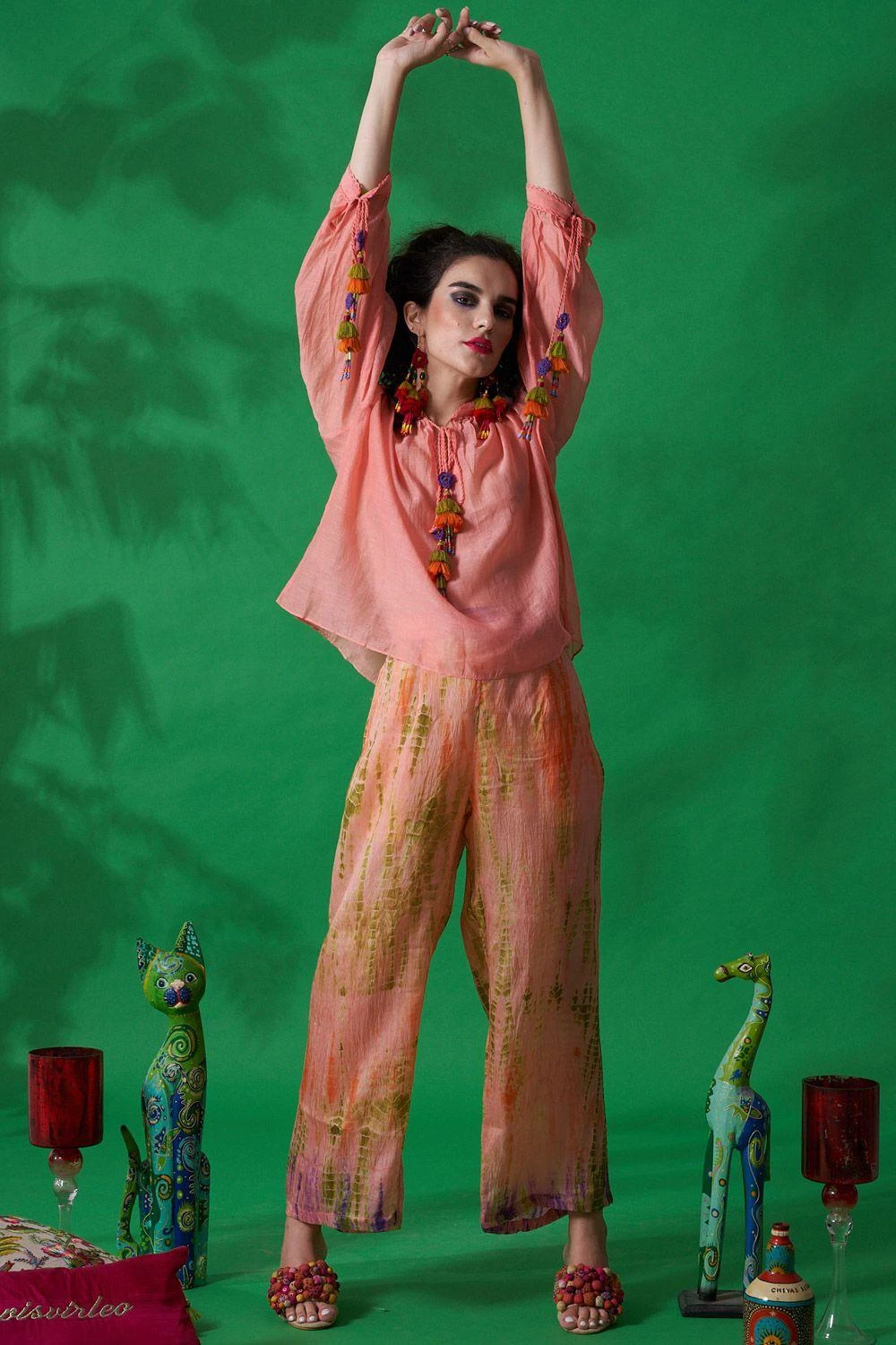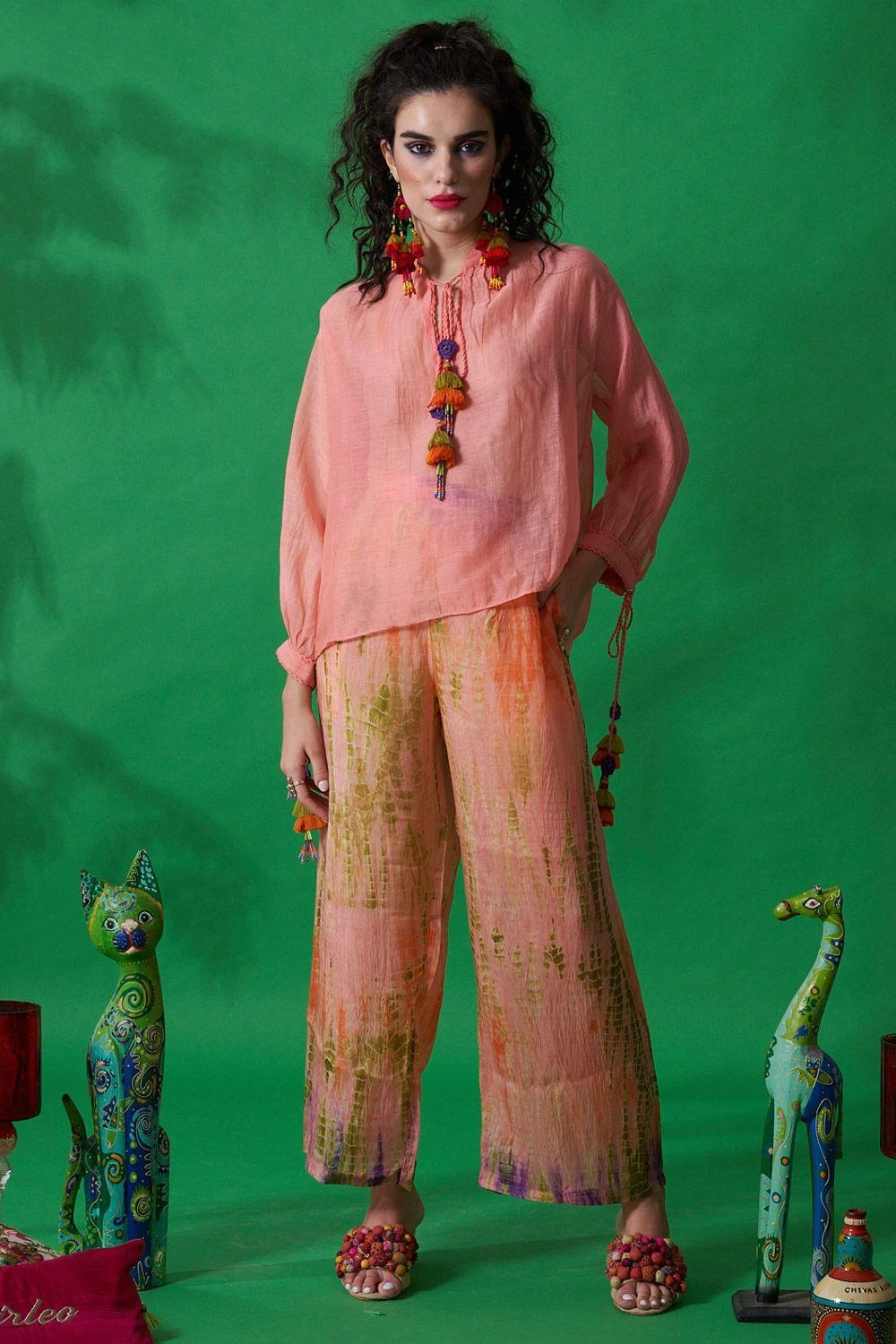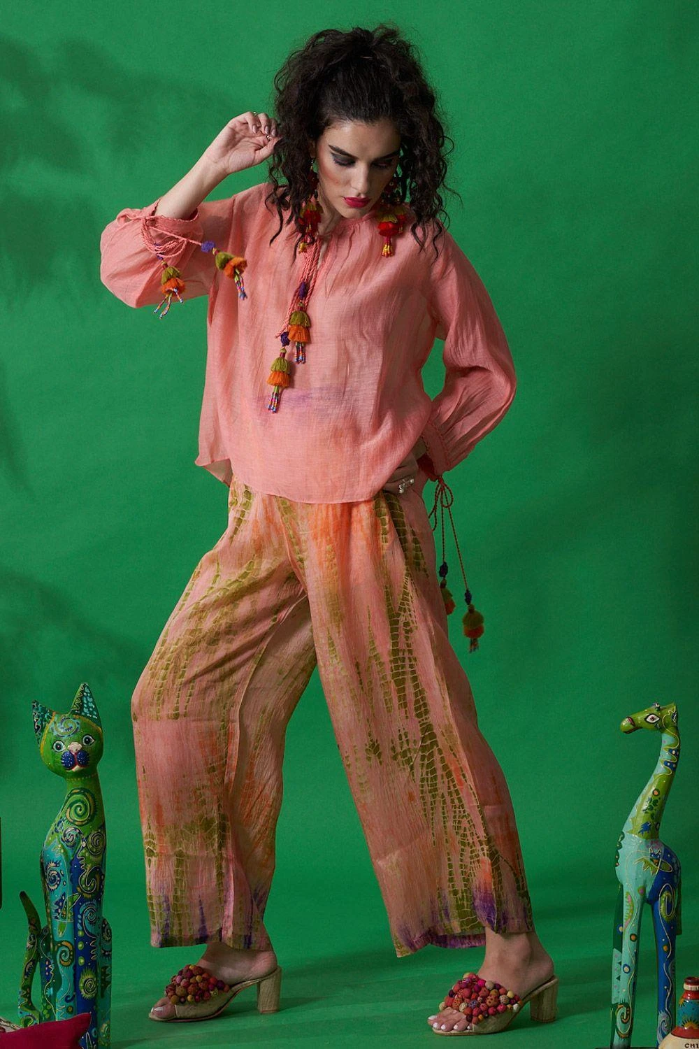Cut in habutai silk, these peach pants feature a tie dye detail with pockets. Style this piece for a casual brunch by pairing it with a tie dye tunic or a shirt for an effortlessly stylish look.