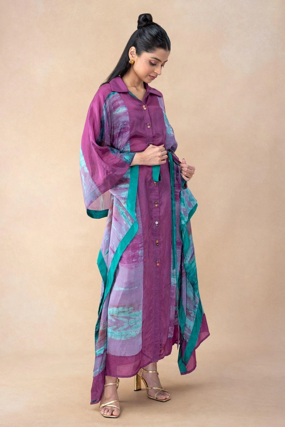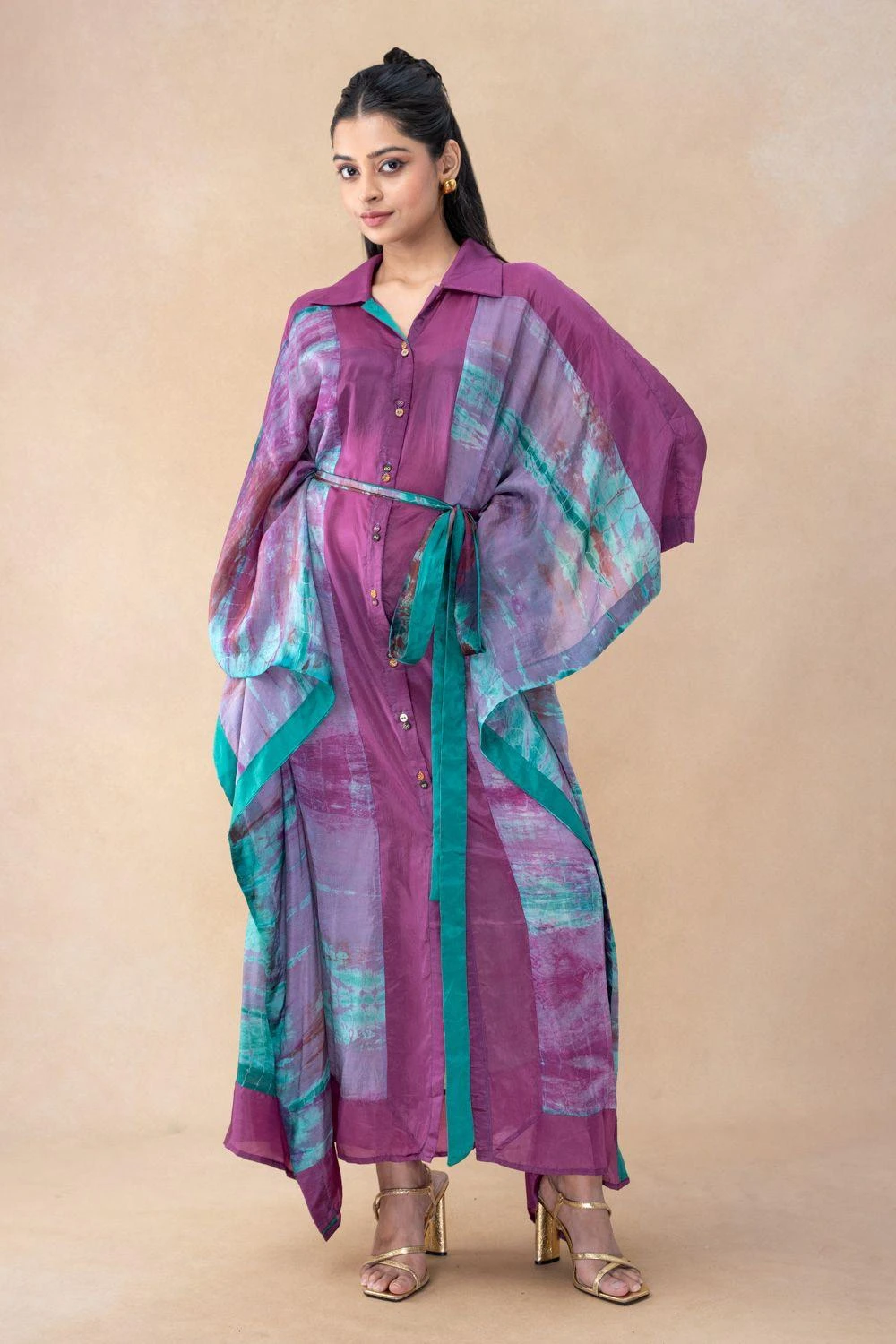 Look effortlessly stylish with this shirt collar long kaftan, adorned with a belt. This ensemble embodies grace and style, capturing attention effortlessly with its blend of modernity and classic sophistication.