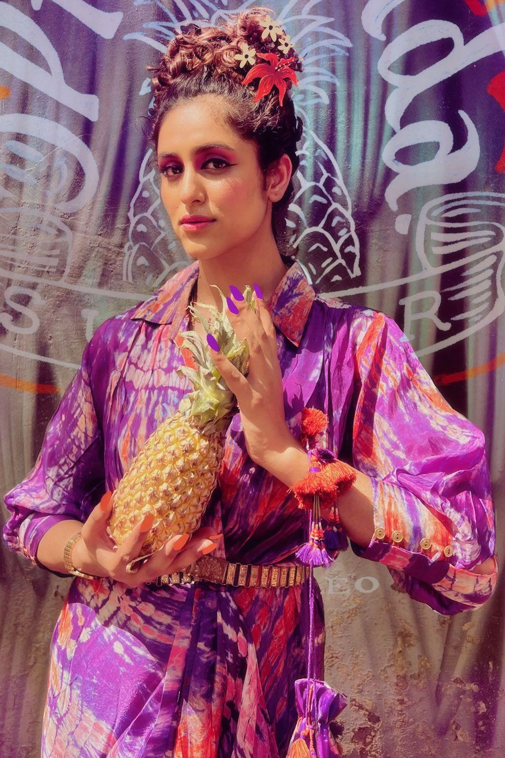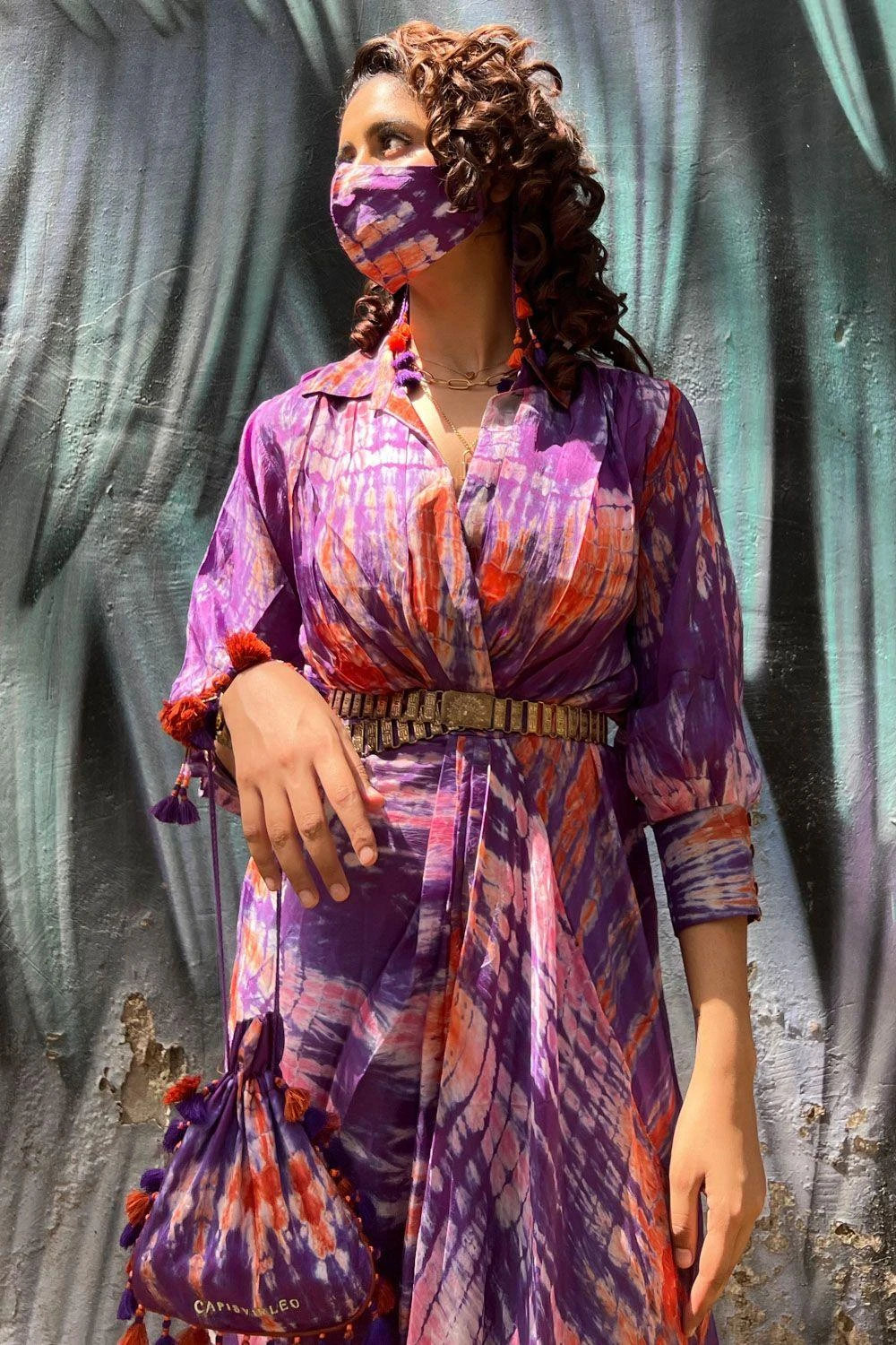 Amp up your summer closet with this easy breezy purple & orange tie-dye dress. It is cut in habutai silk with a shirt collar and an asymmetric hem. You can cinch your look with a bohemian belt.