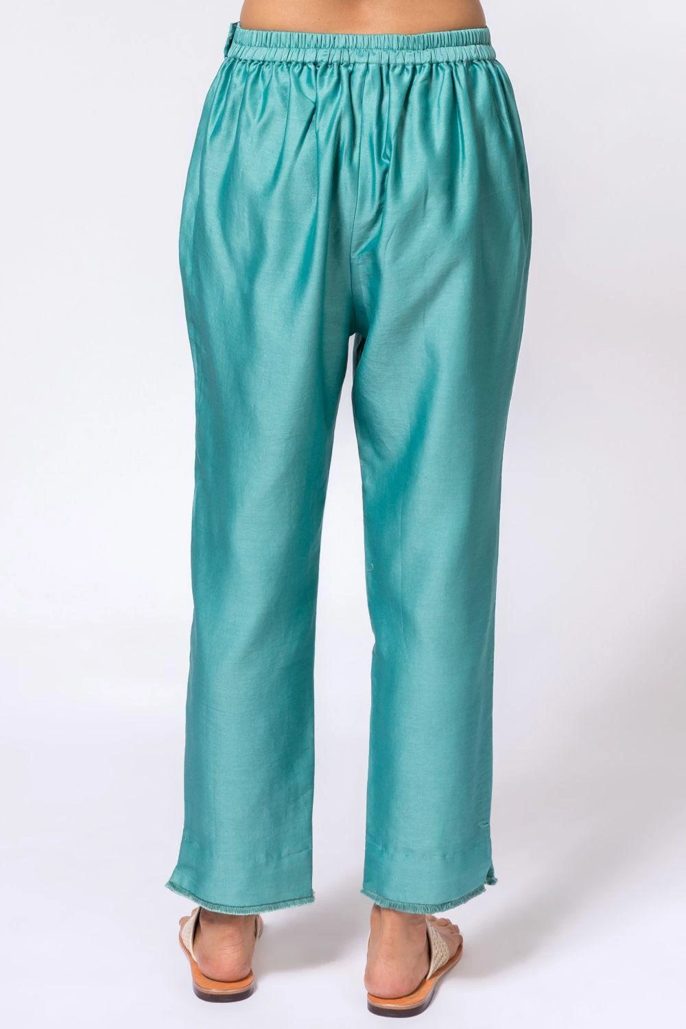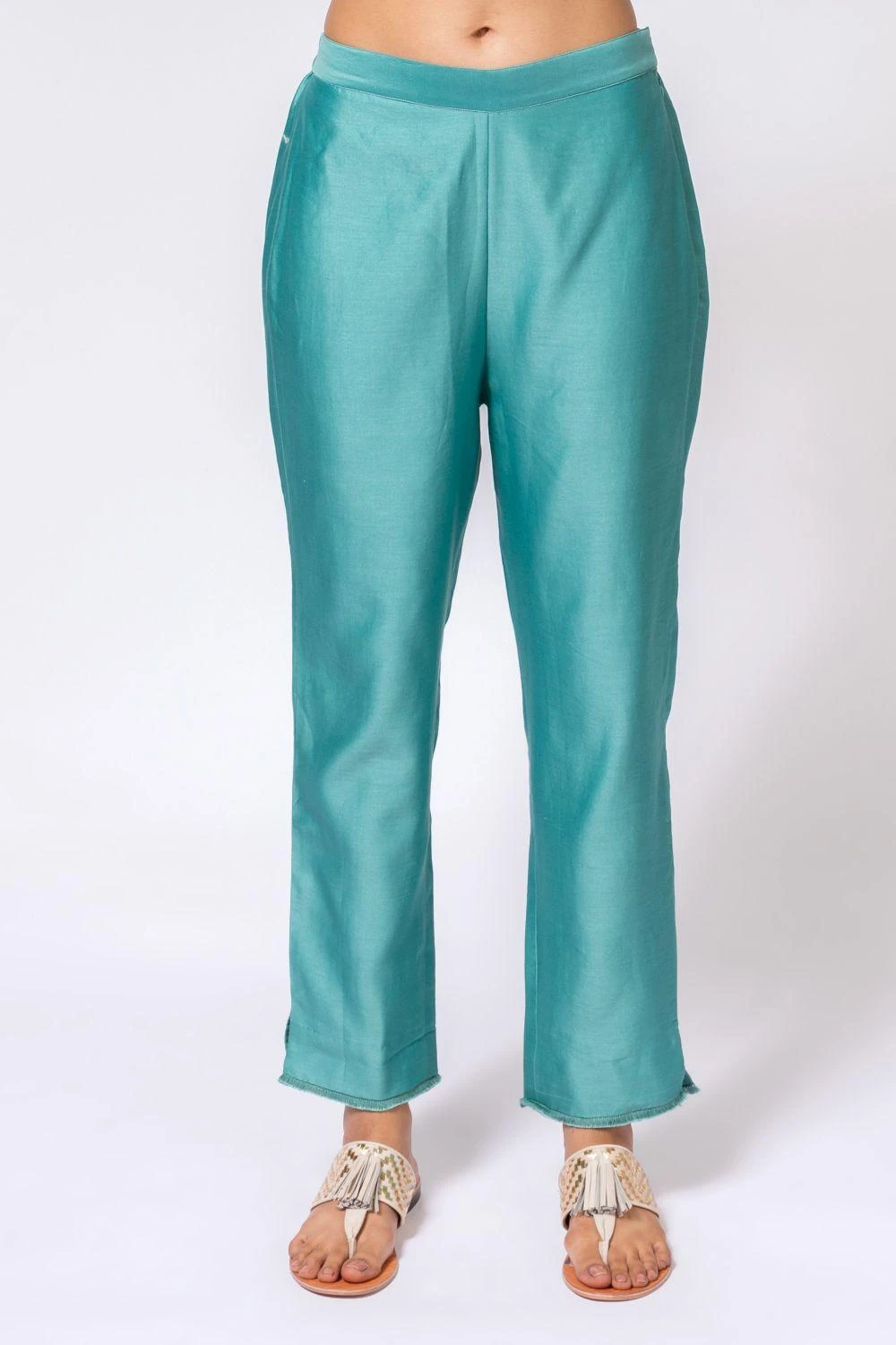 These narrow fit pants are cut in chanderi fabric in a vibrant aqua hue. These can be paired with a coordinating aqua kurta from the collection for a daytime look.