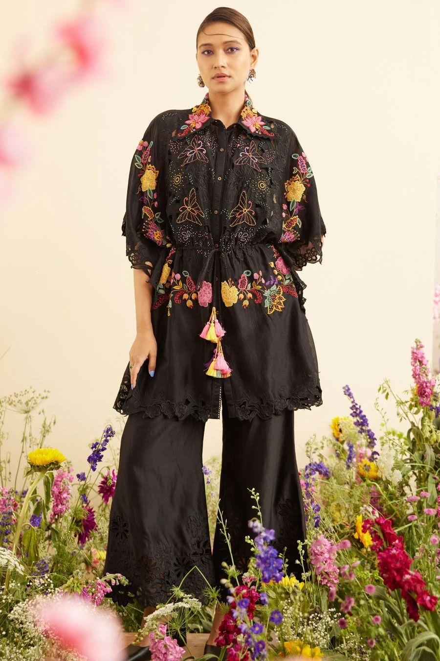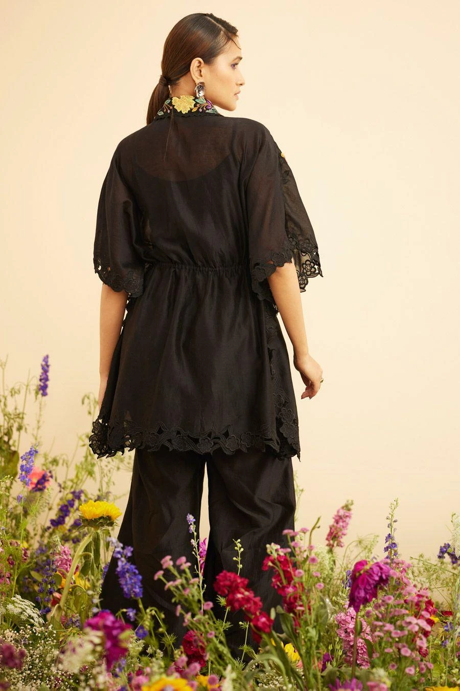 Crafted in chanderi, these black culotte pants feature cutwork details. Style them with a coordinating bustier & applique jacket from the collection to complete the look.
