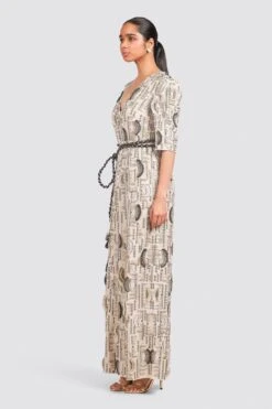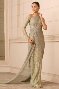 This playful red chanderi smocked yoke midi dress has ruffles on the yoke & sleeves. The yoke is also adorned with floral beadwork. Style this chic dress for daytime events.