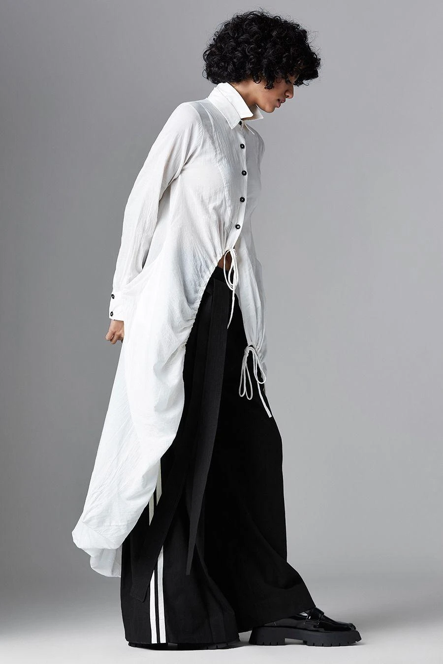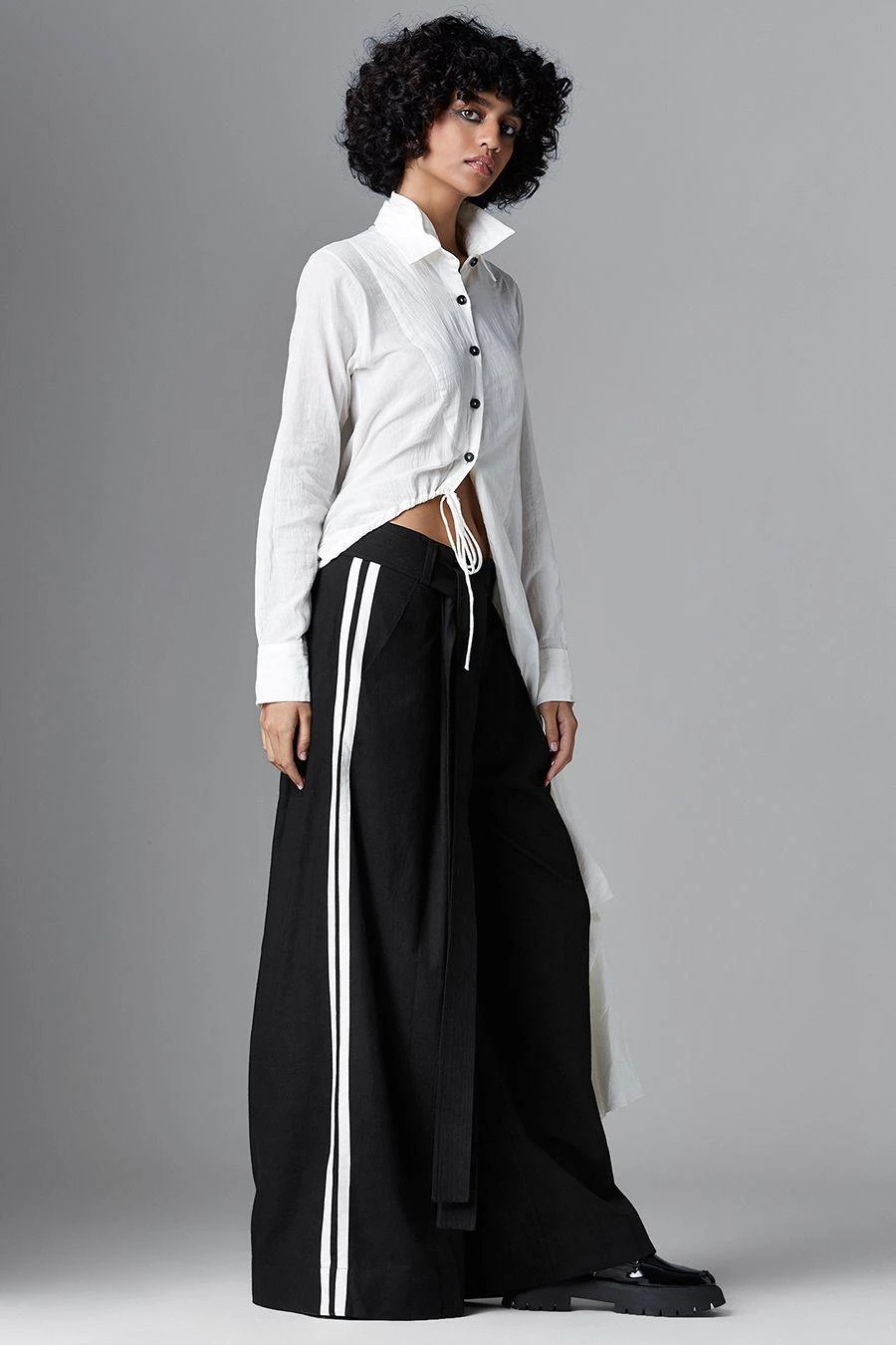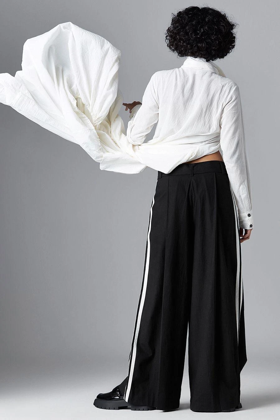 These exquisite pleated trousers feature captivating double side panels and a stunning belt. This mesmerizing piece effortlessly blends classic design elements with contemporary flair, making it the perfect addition to any discerning wardrobe.