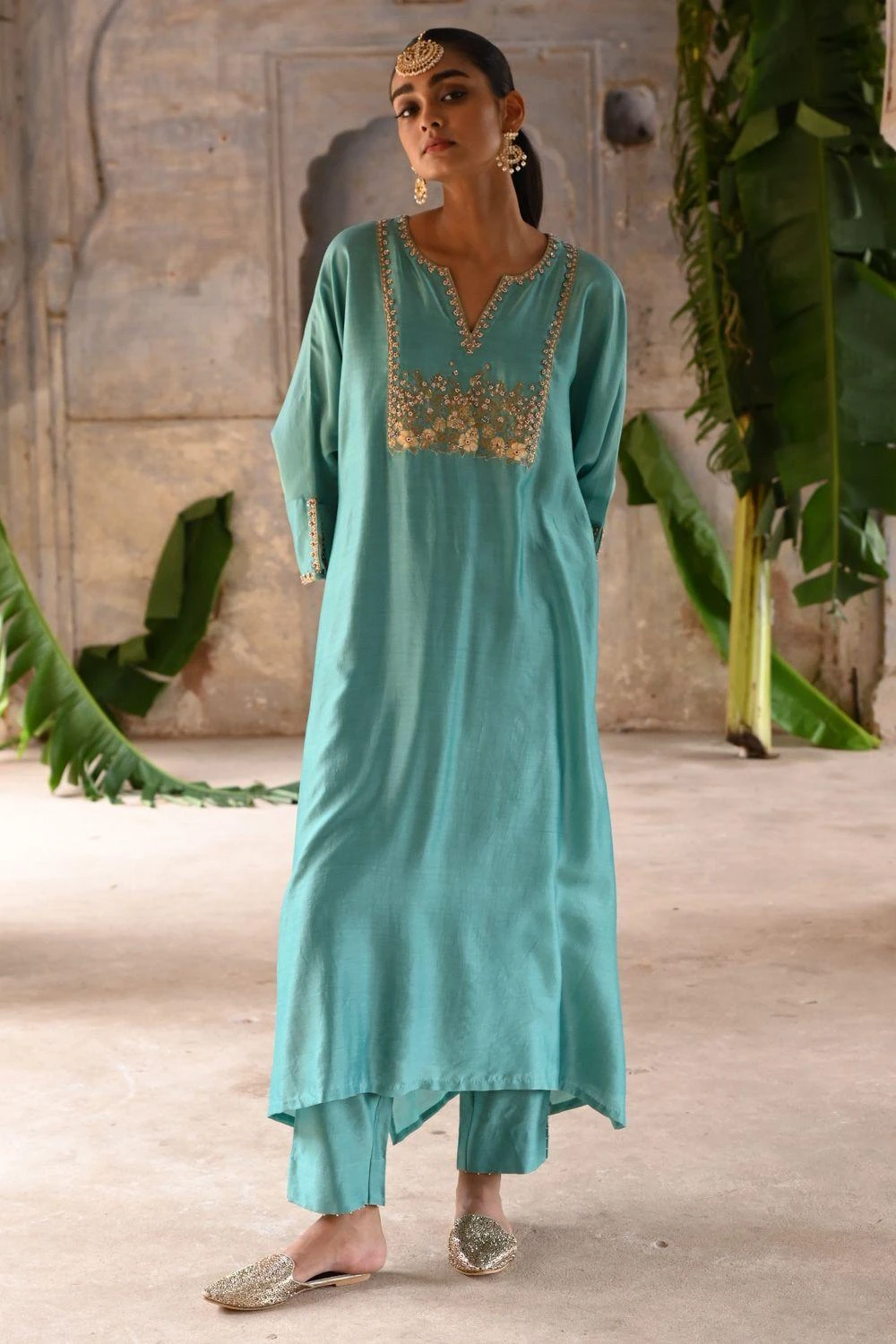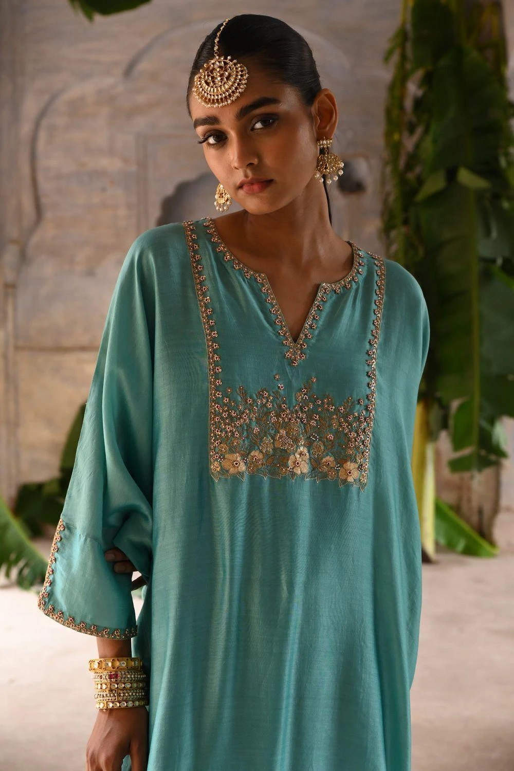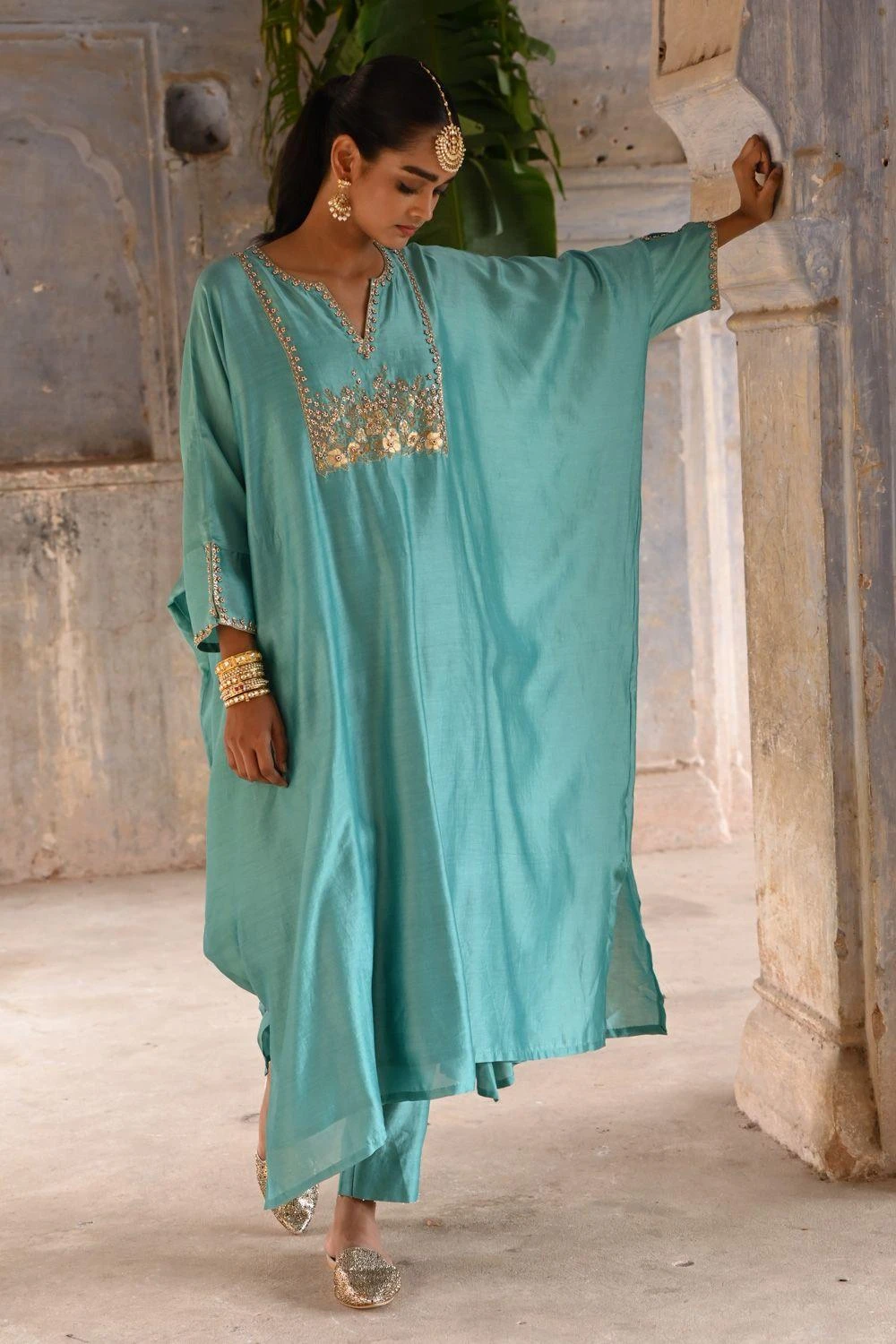 Elevate your style with this Powder Blue Kaftan. Adorned with exquisite phool guccha and booti embroidery in zari, zardosi, and sequins, it’s a masterpiece of craftsmanship. Paired with straight pants for a complete, elegant look.