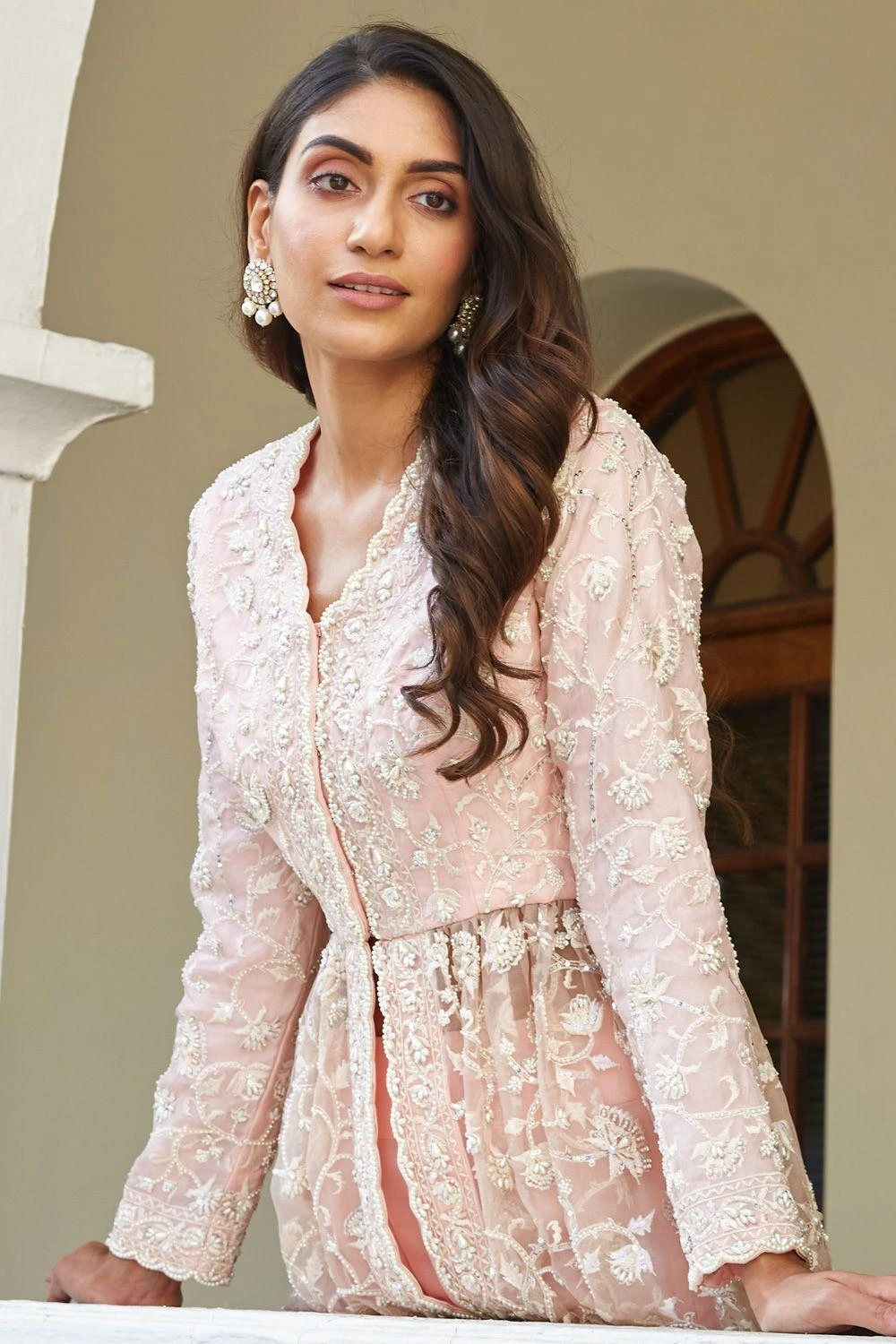 It’s all about sharara sets this season, and what better than in a combination of soft palette and charming silhouette. This pink sharara set features a V neck embroidered jacket & a pair of voluminous sharara pants.