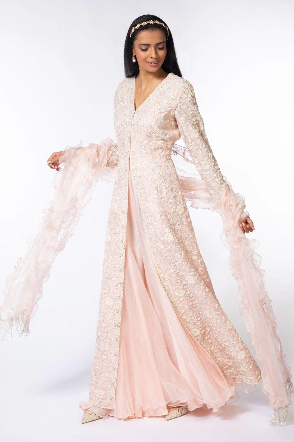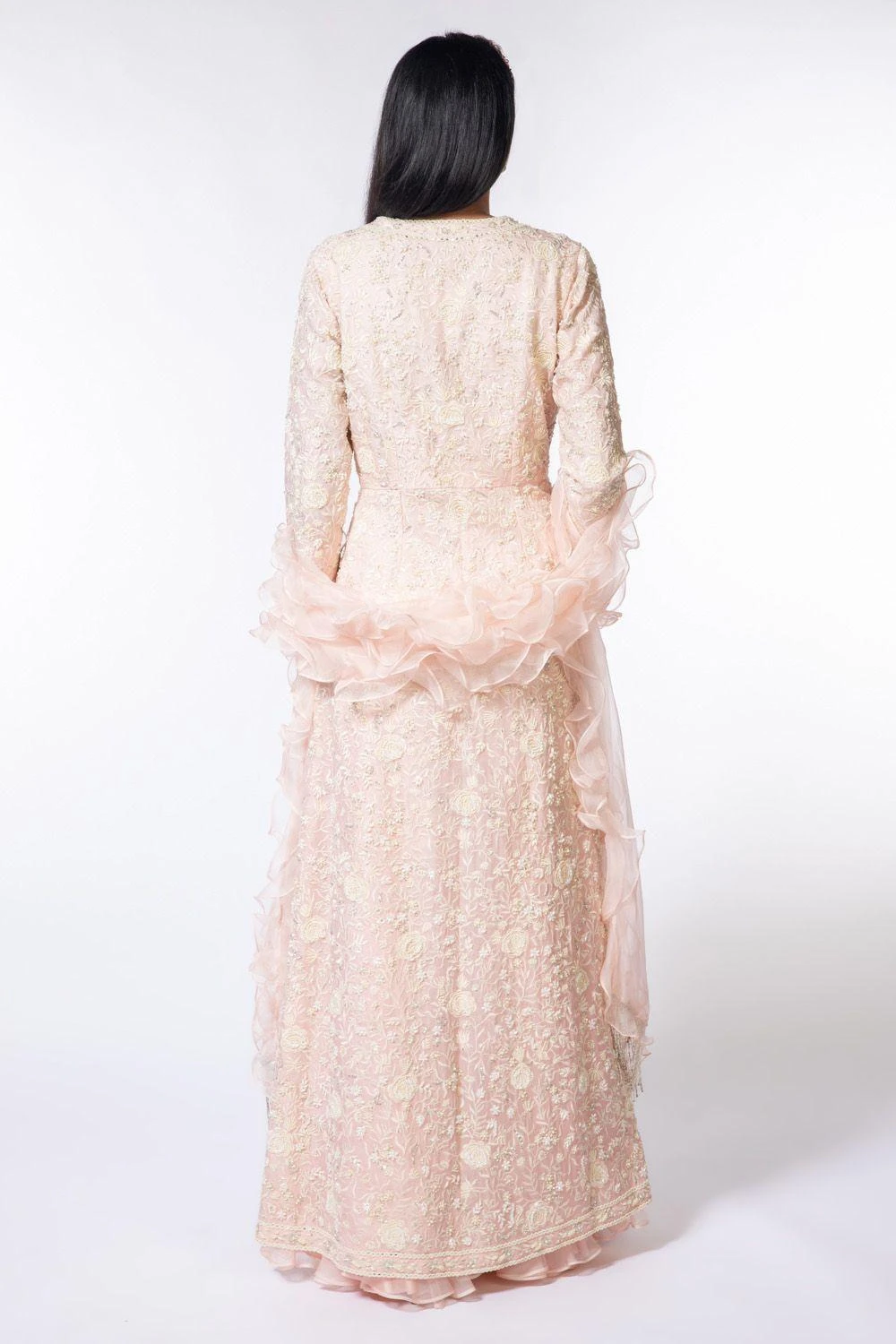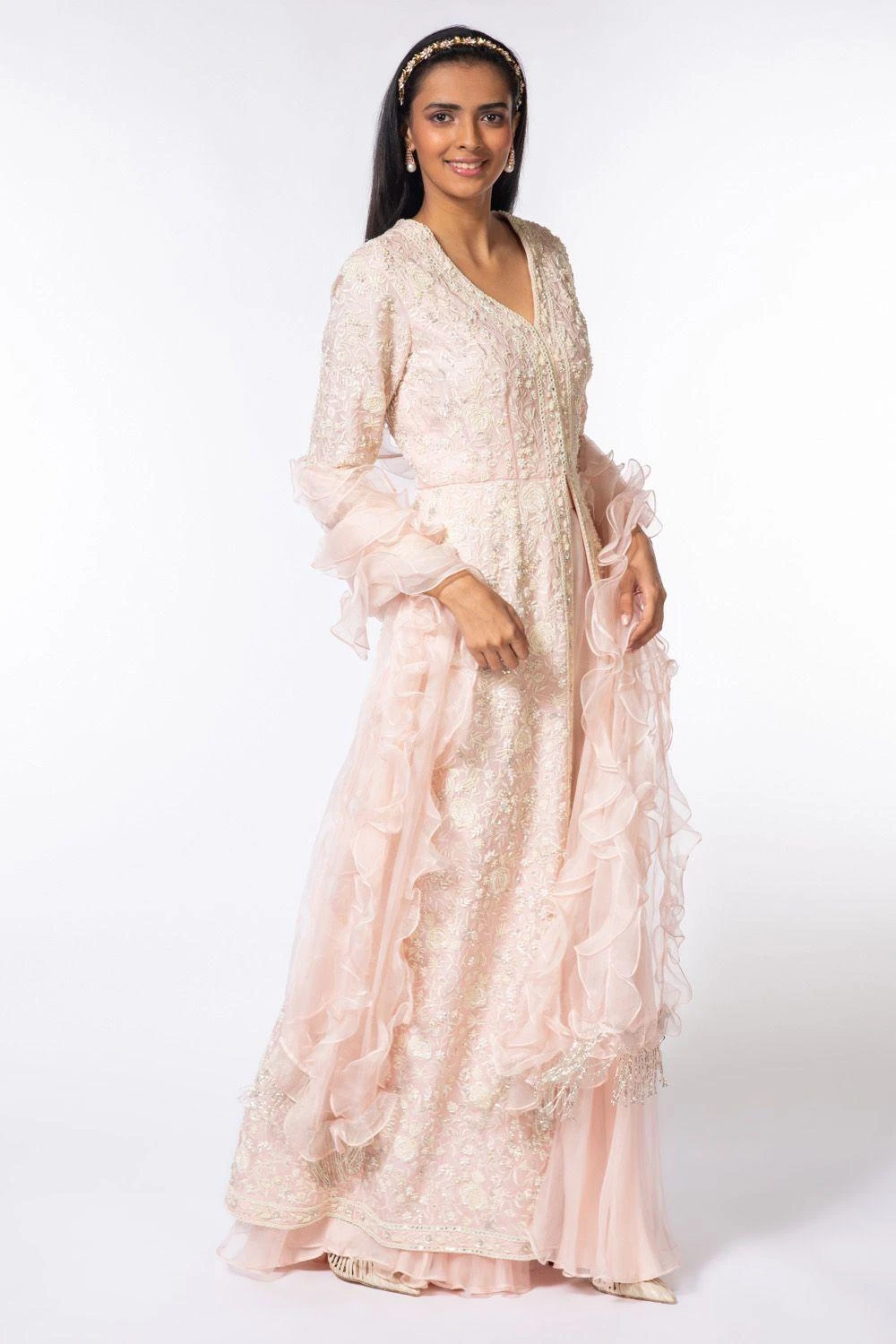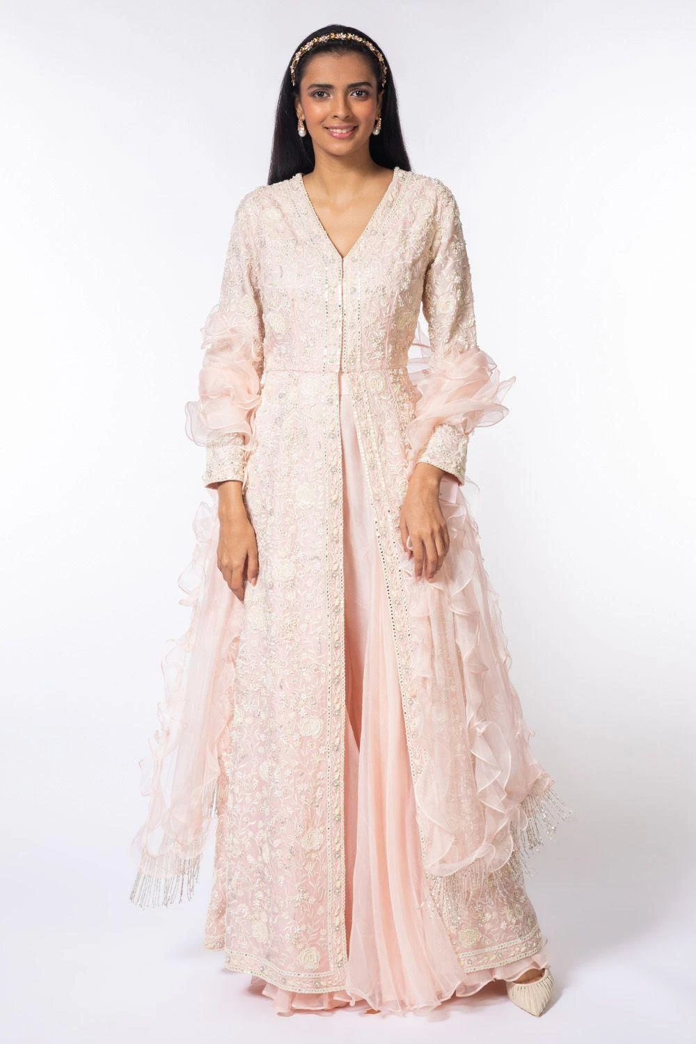 Look like a modern day princess in this alluring pink sharara set. It features a long embroidered kurta laden with intricate embroidery, teamed up with a pair of whimsy sharara and ruffle dupatta. Adorn a pair of pearls with this look.