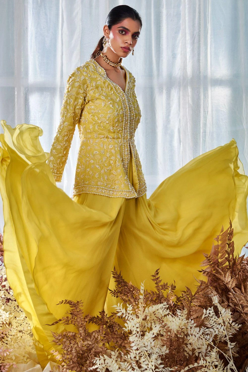 This vibrant yellow sharara set is perfect for summer wedding festivities. The short peplum kurta is heavily embroidered with threadwork, beadwork & sequins details. The flowy organza sharara adds a graceful charm to this playful look.
