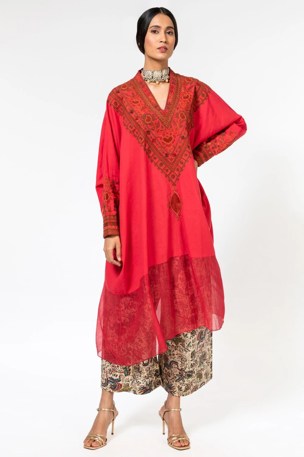 Easy & comfy is the new dressy and this red kaftan set perfectly fits that bill. It features a V-neck kaftan kurta highlighted with beautiful embroidery details. It is paired with contrast printed palazzo pants.