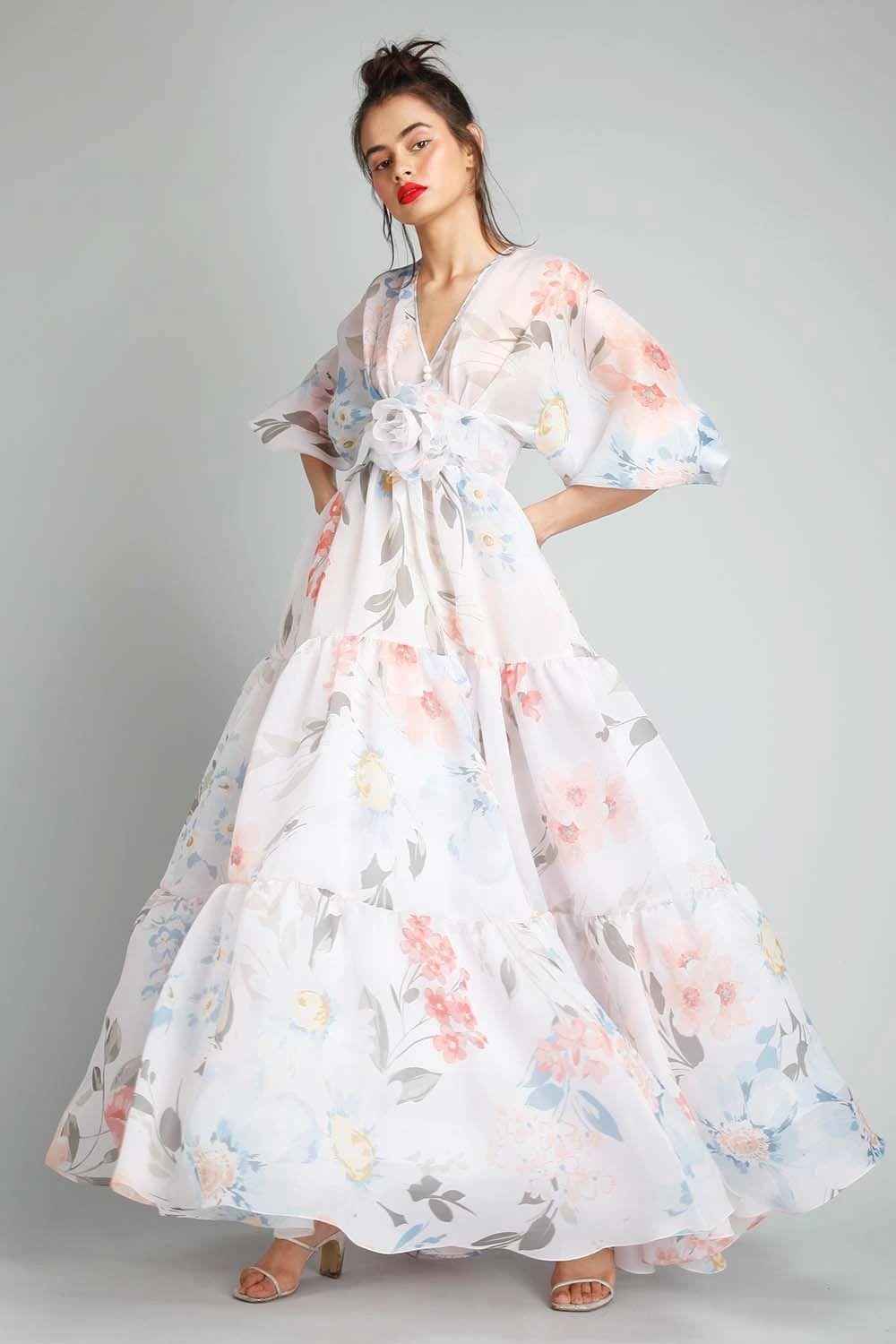 This maxi peasant cut gown will have you flounce like a fairy. Woven in white floral print organza, this gown features a V neck and pouf sleeves. The yoke is adorned with a white frilled flower. Modern elegance in retro silhouette.