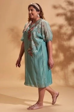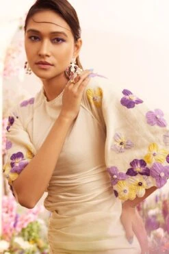 Inspired by a tropical garden, this ivory mini dress is hightlighted with intricate embroidery in bright hues. The flattering silhouette & breezy chanderi fabric make this the perfect look for a summer brunch.