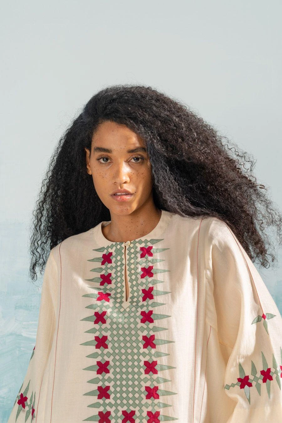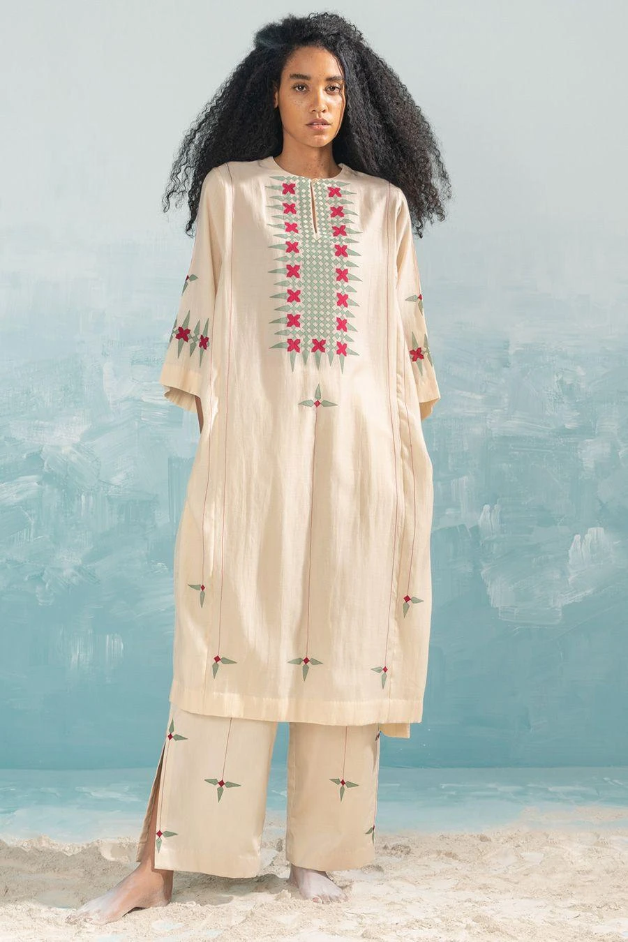 This Beige nile applique kaftan falls in the realm of luxe minimalism. Crafted in cotton silk chanderi, this kurta features handcut applique & cutwork details. Style them with the Beige nile straight pants from the collection to complete the set.