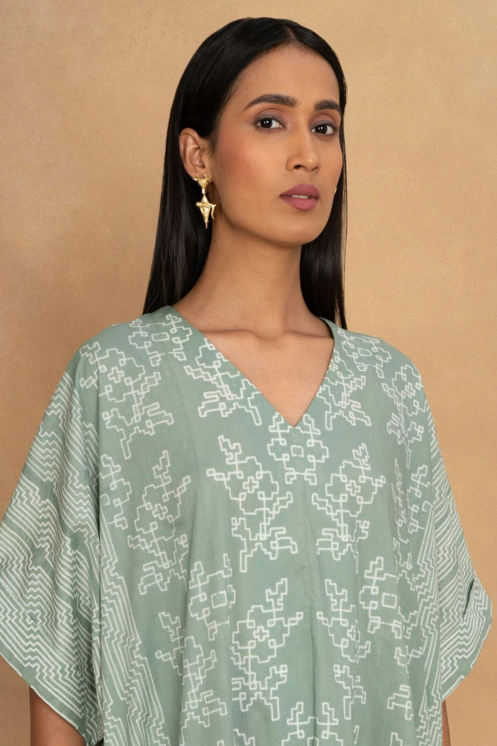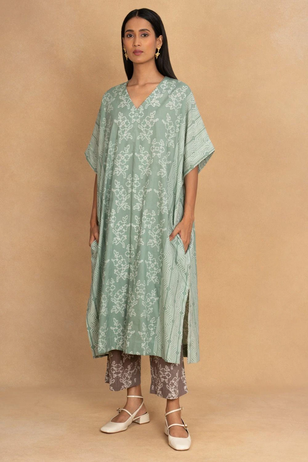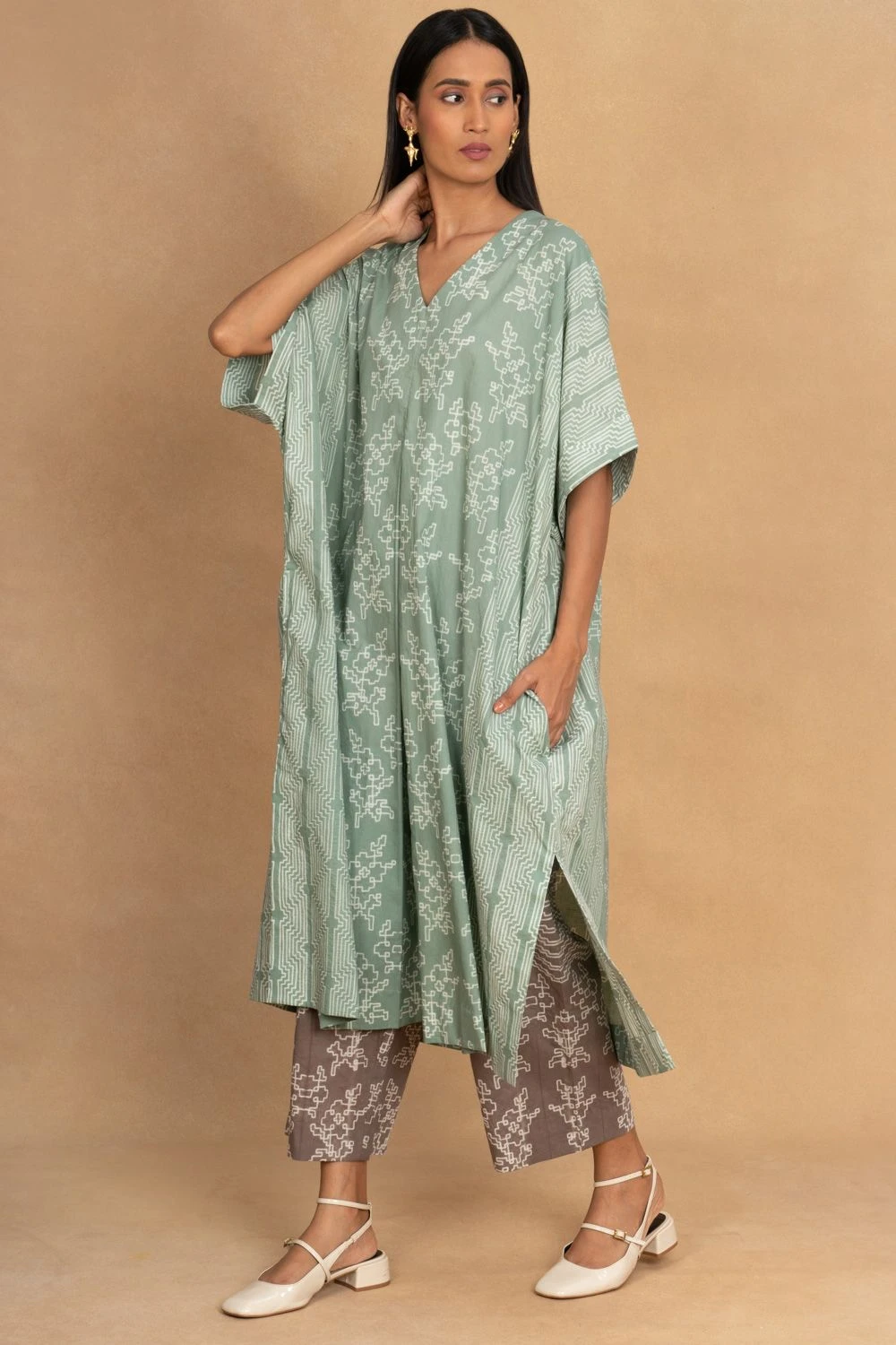 Look effortlessly stylish with this Granite Green Shibori Pleated Kaftan Dress. The mesmerizing shibori pattern and flowing pleats create a captivating fusion of elegance and grace.