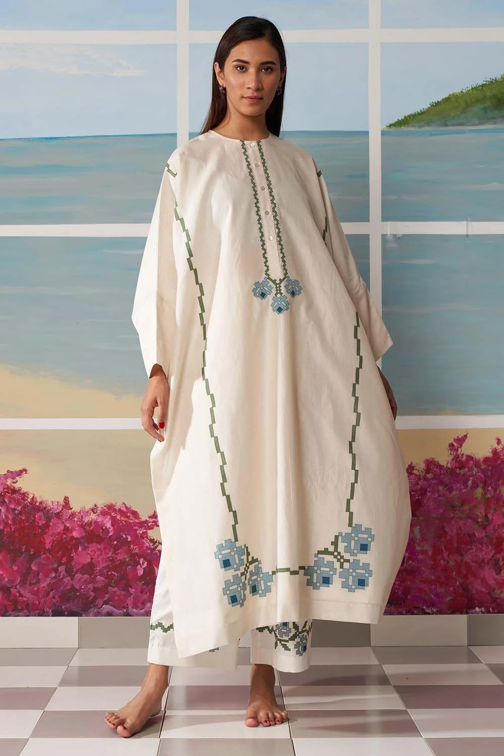 Artistically designed, this kaftan features a table mat pattern running over the canvas. It is embraced with exquisite rose applique on the corners. Get ready to lounge in luxury with this comfortable and relaxed kaftan.