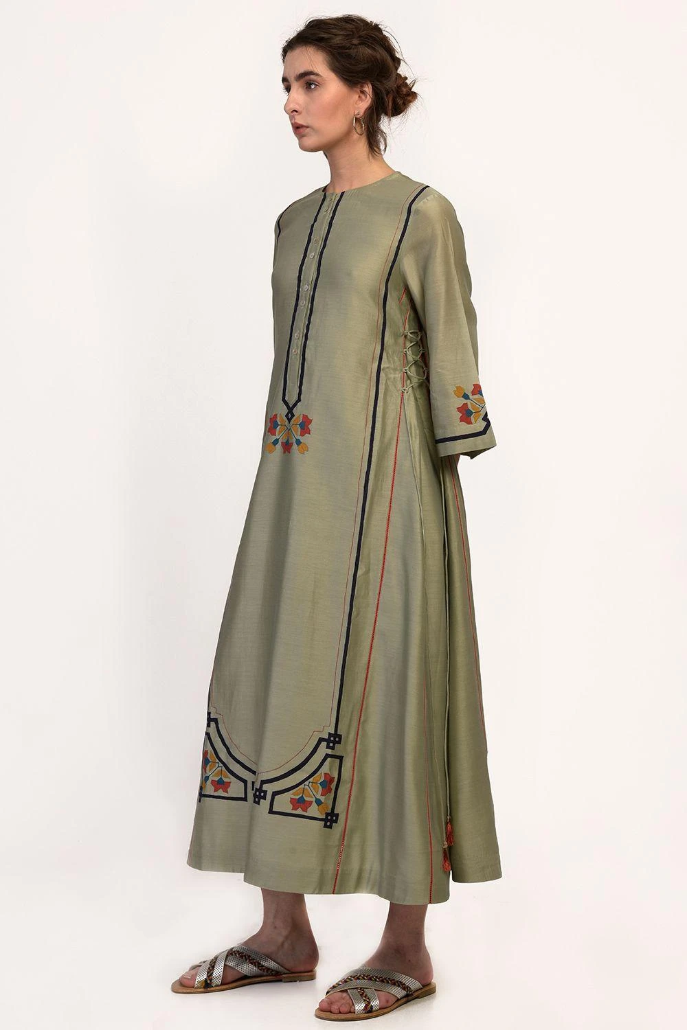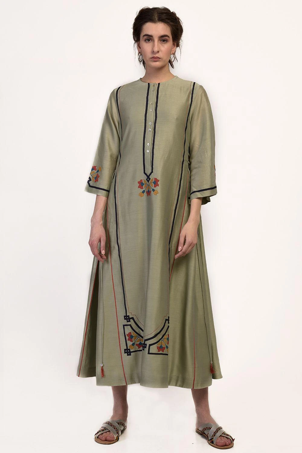 This A line dress in mint green with signature Ikai hand-cut applique is chic & forgiving. Wear it with leather straps for a casual brunch or pair with ankle length pants & tassel earrings for a formal evening.