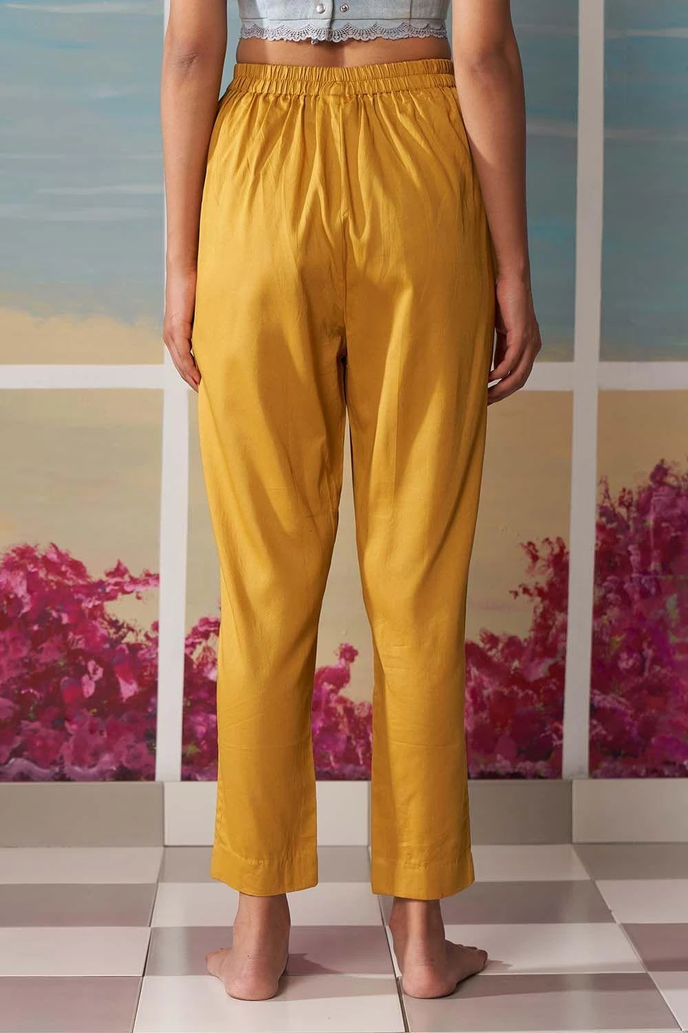 These mustard tapered pants can be styled with a loose tunic or kurta to create an effortless summer look. The tapered pants & elastic waist are both comfortable & flattering.