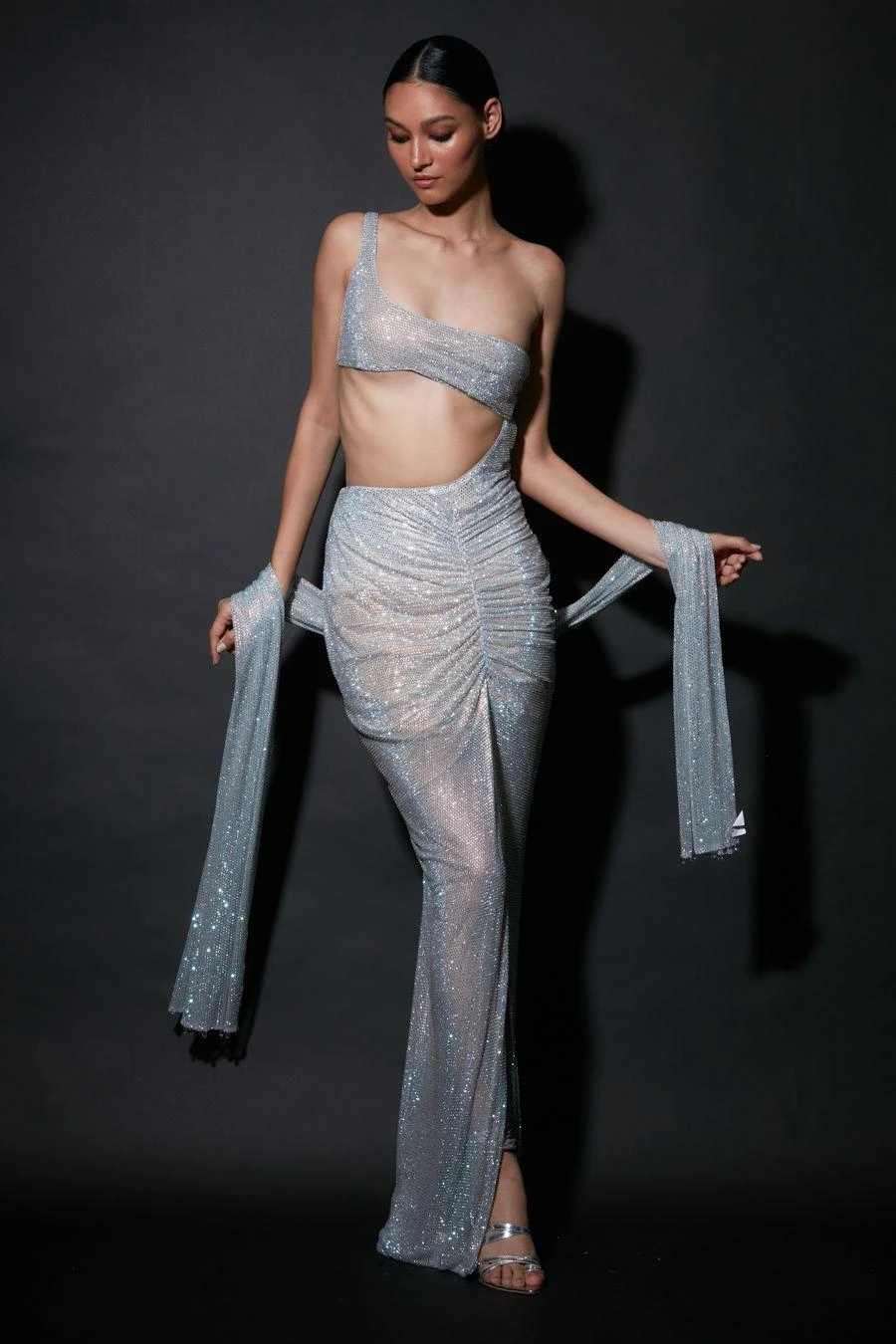 If you’re looking for a head-turning statement-making gown that isn’t too heavy, this is the dress for you. Crafted in net, this one shoulder cut out gown features ruched details & is paired with a coordinating stole