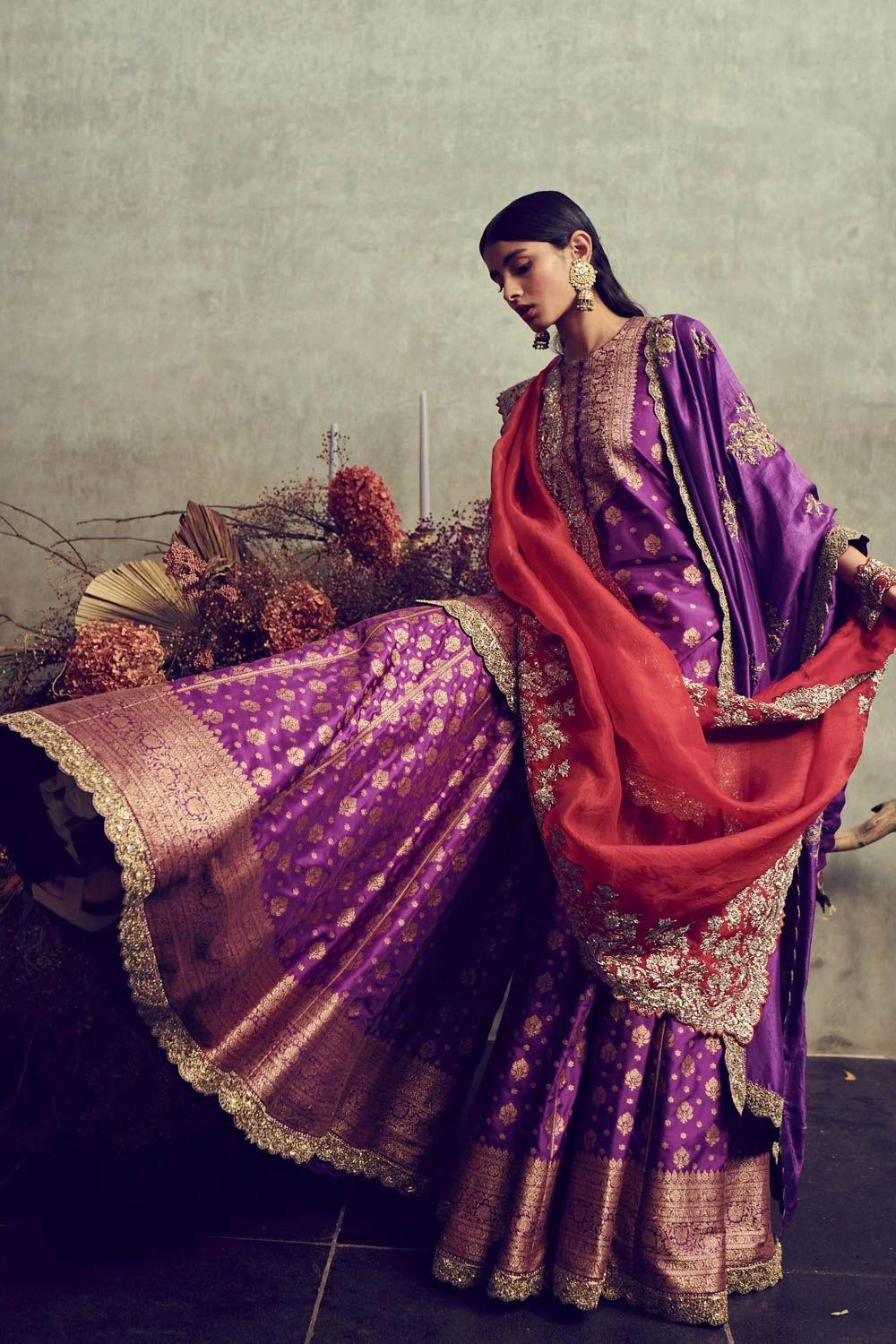 This ethereal purple banarasi sharara set comes with an organza dupatta. Style this heirloom piece for an engagement or sangeet for a timeless look.