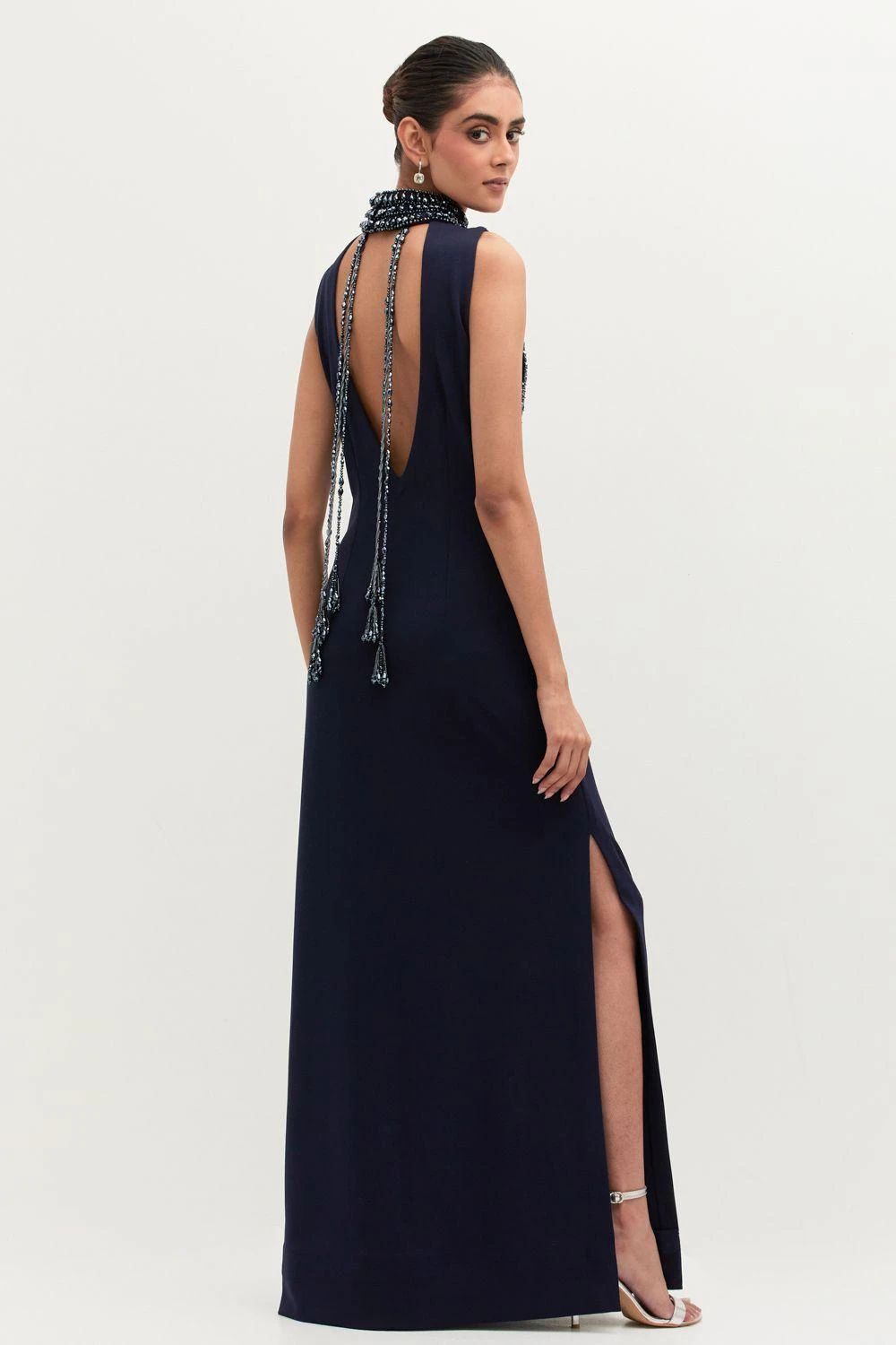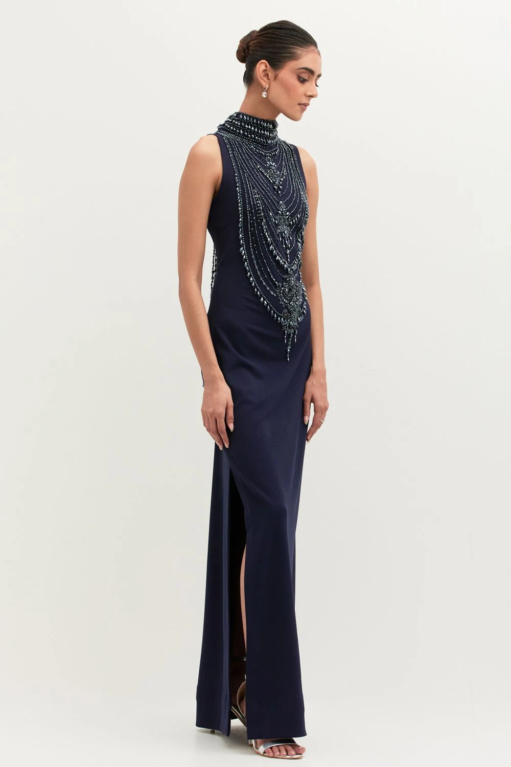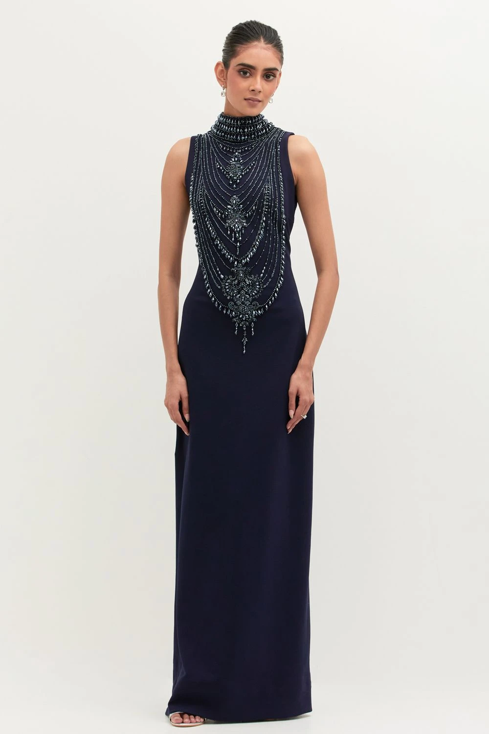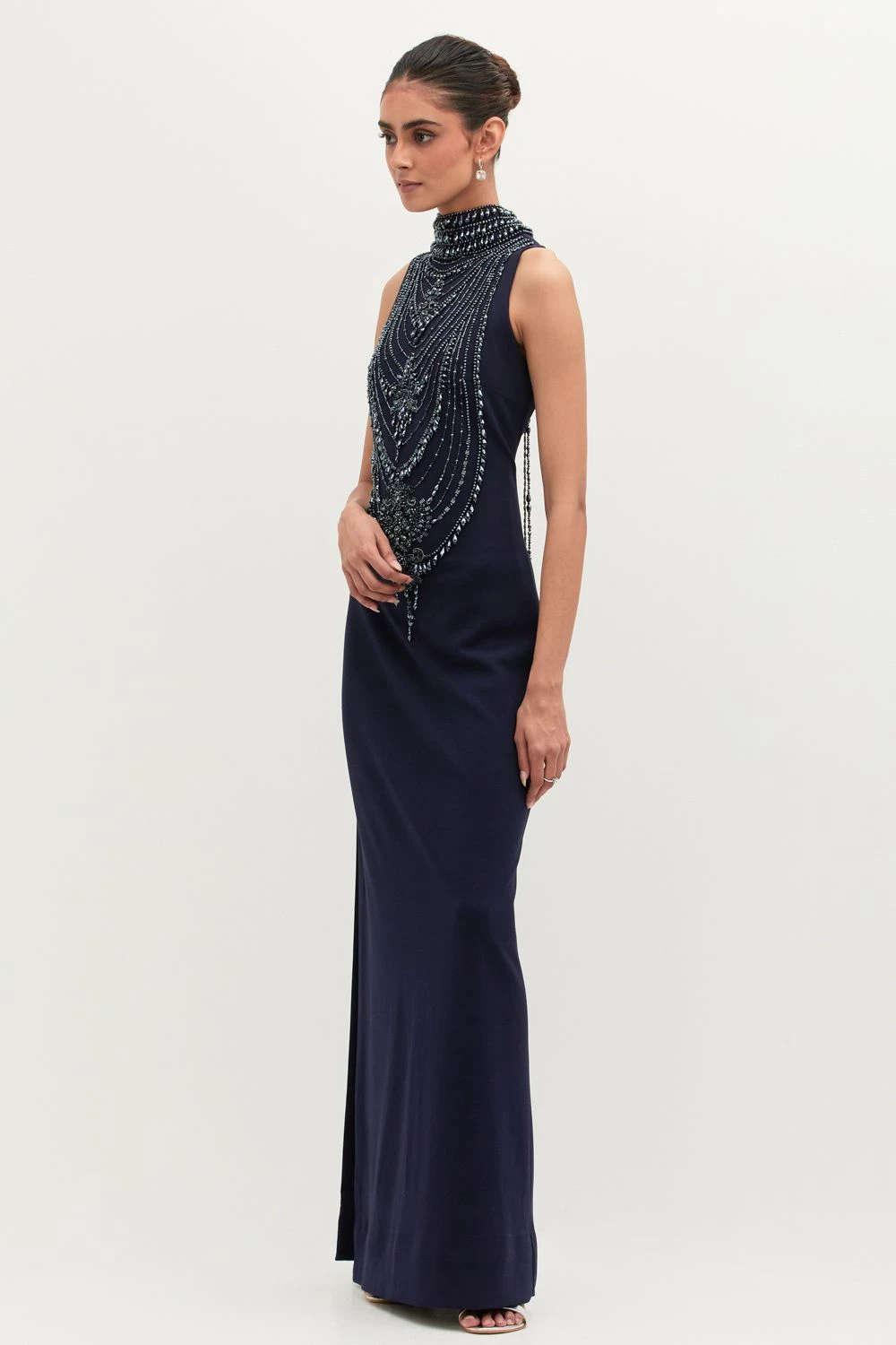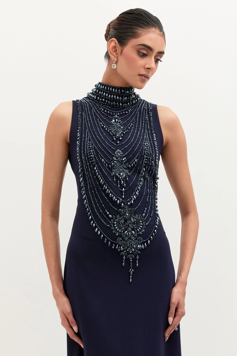 If you’re looking for a head-turning statement-making outfit that isn’t too heavy, this is the dress for you. Crafted in georgette, this high neck dress features pearl embellishments. Add a pair of statement earrings to complete the look.
