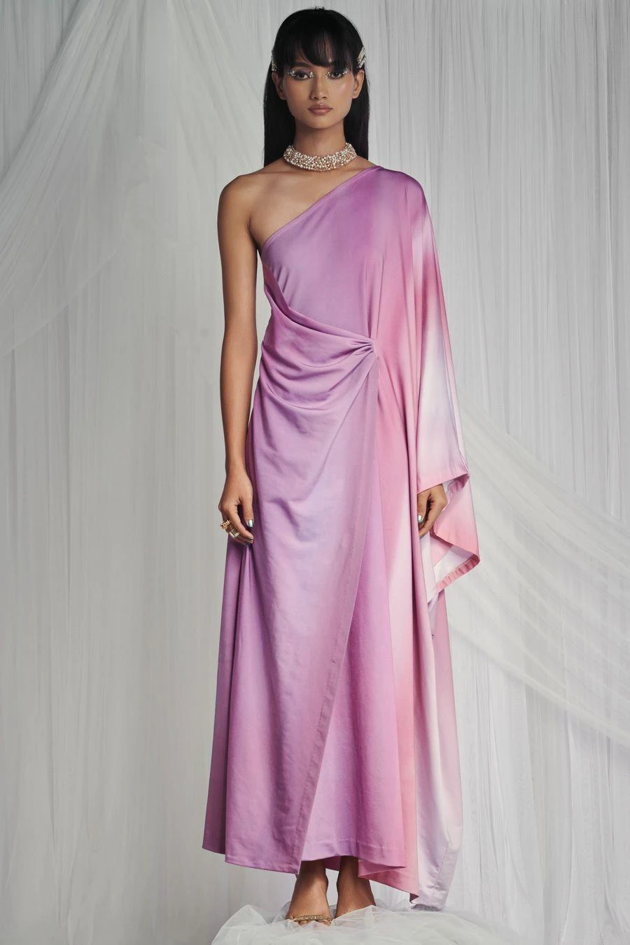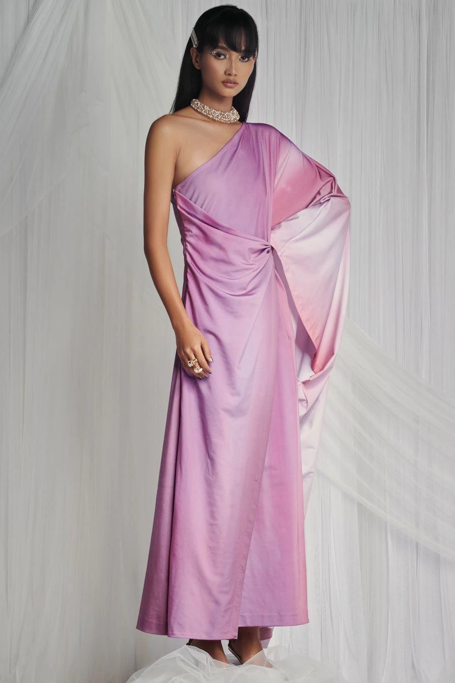 If you’re looking for a head-turning statement-making gown that isn’t too heavy, this is the dress for you. Crafted in lycra, this one shoulder ombre shaded gown features draped details.