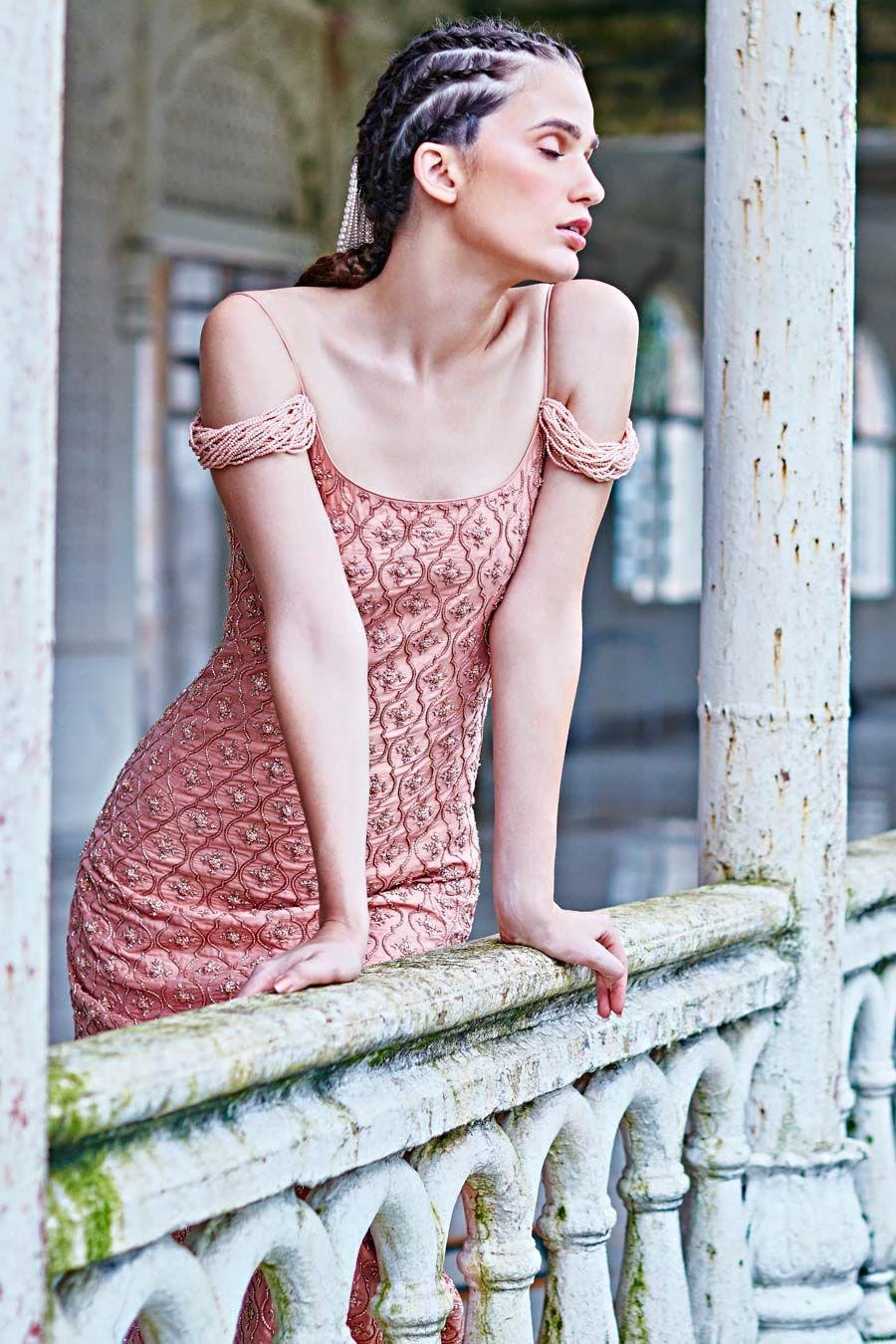 If you’re looking for a head-turning statement-making gown that isn’t too heavy, this is the dress for you. Crafted in dupion silk, this nude pink gown features hand done motifs.
