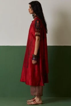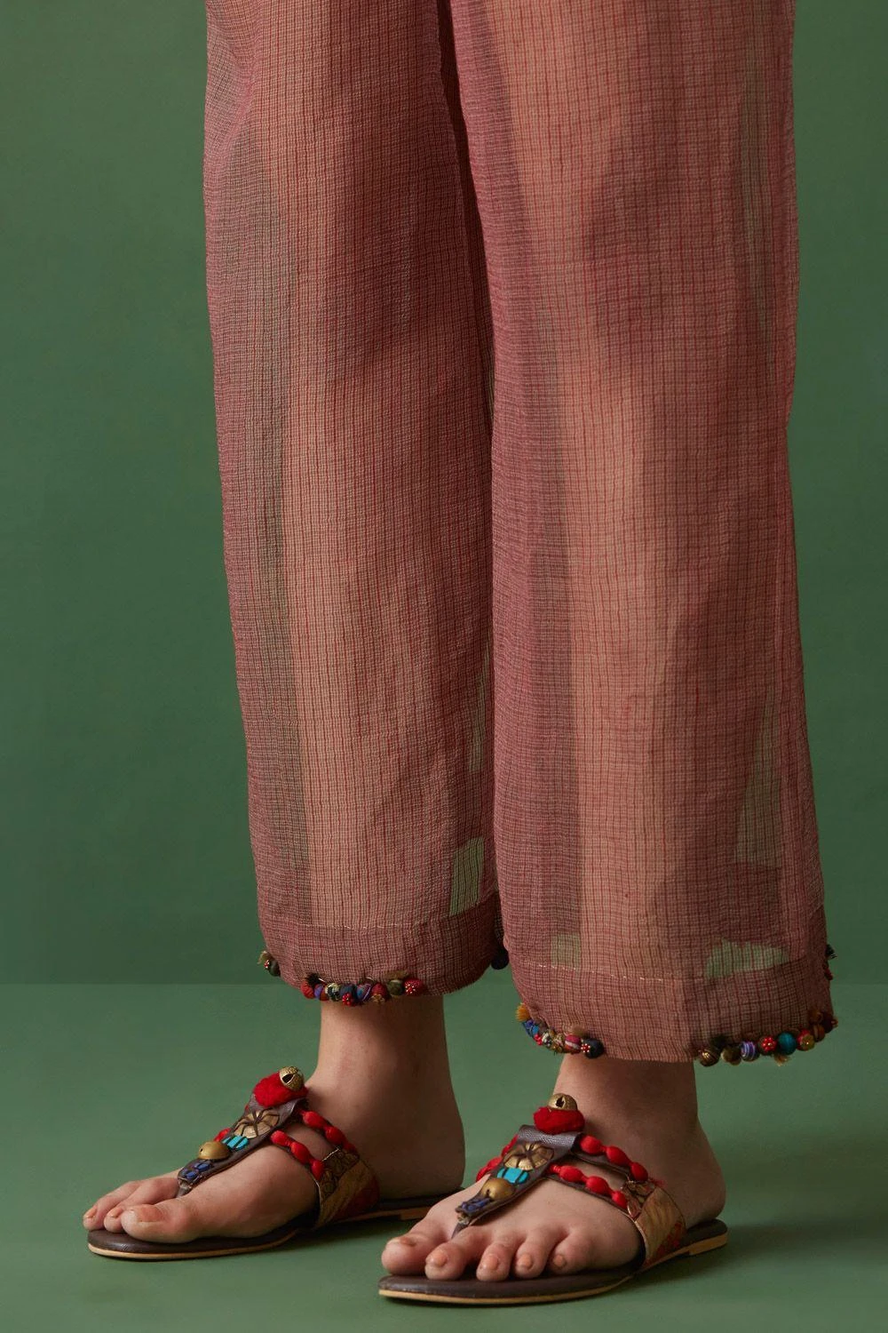 Crafted in a tissue fabric, these pink translucent pants feature hand embroidered details at the hem with an inner lining. Style this piece with a red embroidered kurta to complete the set.