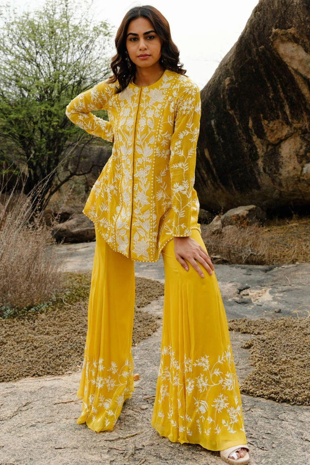 This sharara set will see you through all kinds of festivities. It comes with a kurta, sharara & dupatta. Cut in georgette, this set features thread work embroidery highlighted with pearls, cutbeads and sequins.