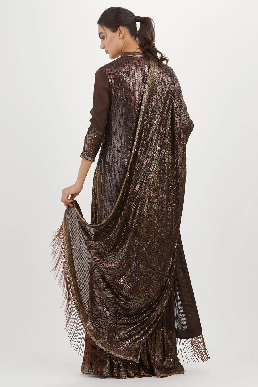 The perfect amalgamation of style & comfort, this set works across occasions. Crafted in chiffon, this set features a sequin embroidered kurta paired with a coordinating sharara and a dupatta. Add a pair of statement earrings to complete the look.
