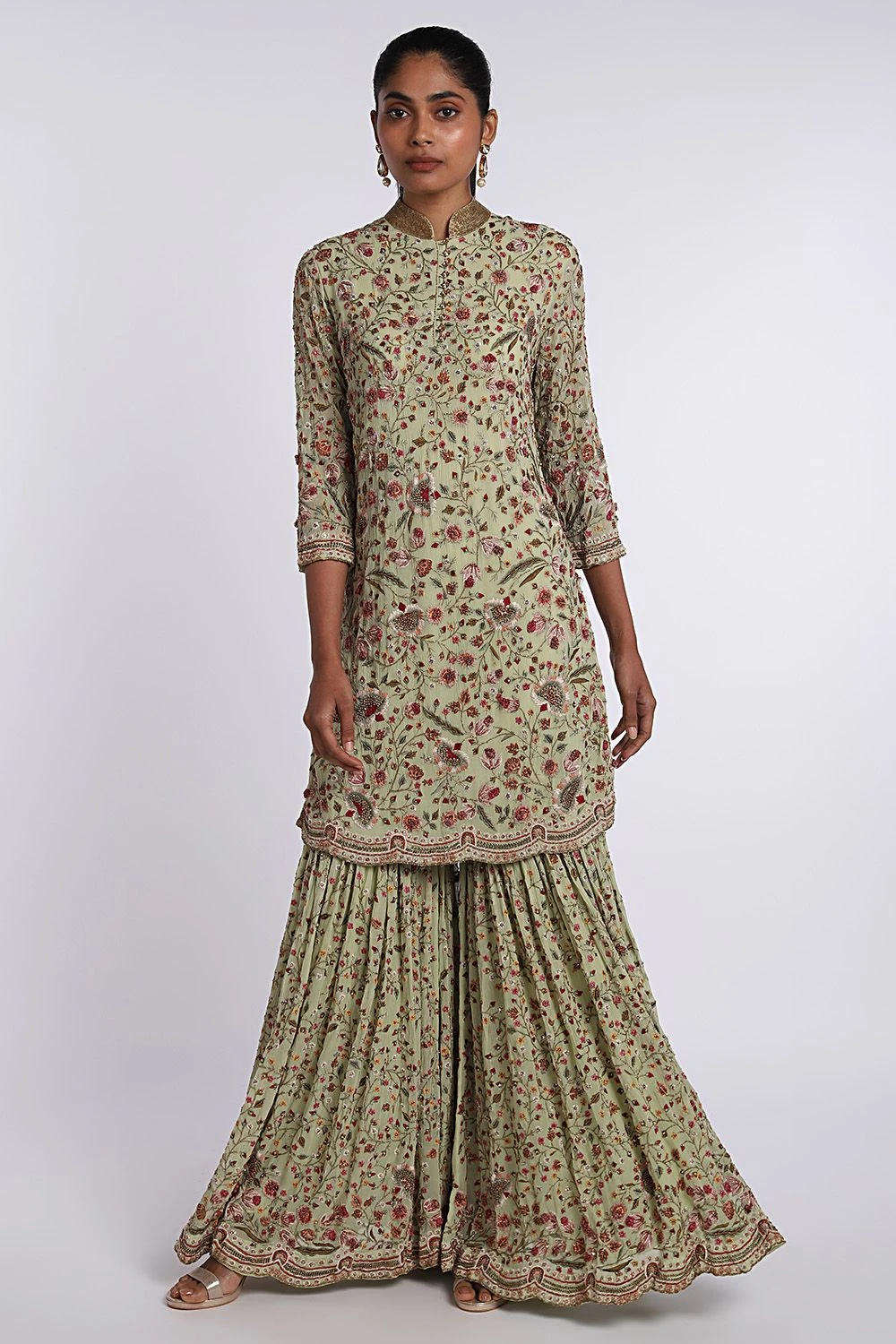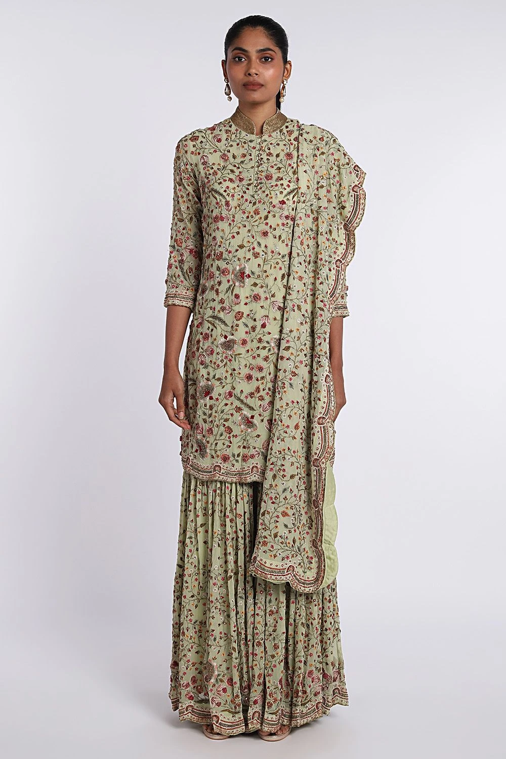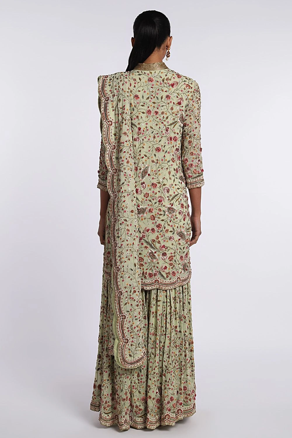 Florals on a pistachio palette. Look closer and you will see the fineness of it’s resham embroidery, embellishments and a fully sequinned collar for that perfect finish.