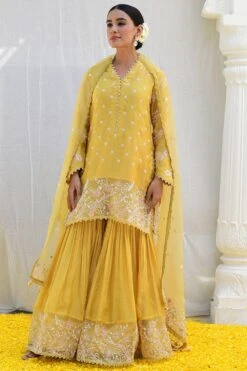 Dive into opulence with this sharara set. Intricate embroidery featuring zari dori, vibrant resham, and dazzling tikkis adorn the ensemble. The spiral design on the sleeves and captivating buttis on the sharara, define exquisite craftsmanship.
