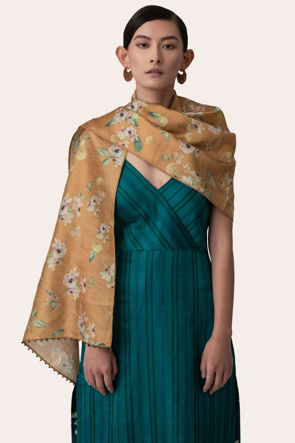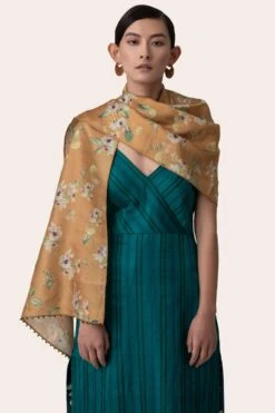 This mustard printed rectangular scarf with all-over metallic edging ensures you an instantly elevated look. It is handwoven in luscious silk fabric with golden zari details.