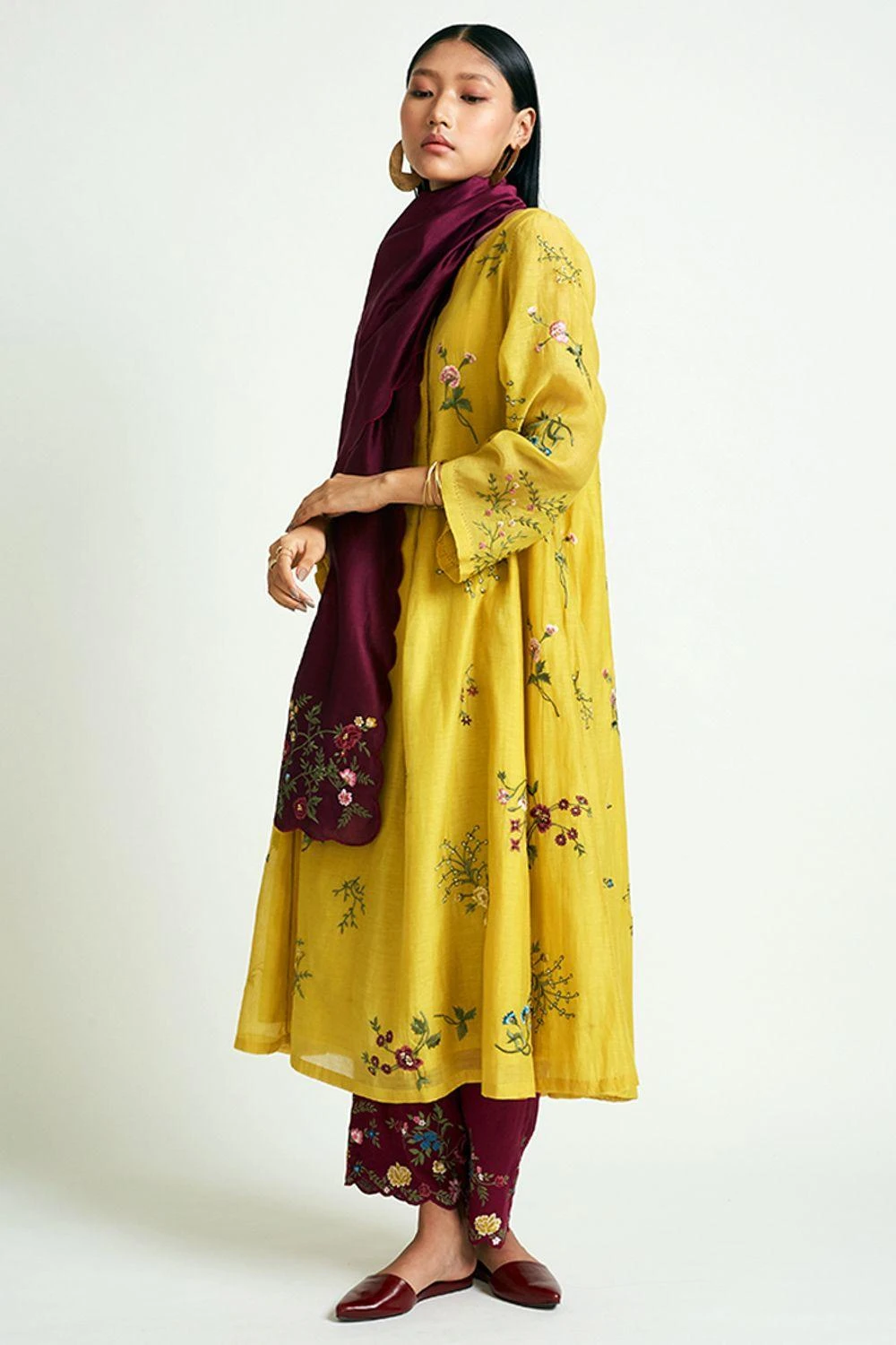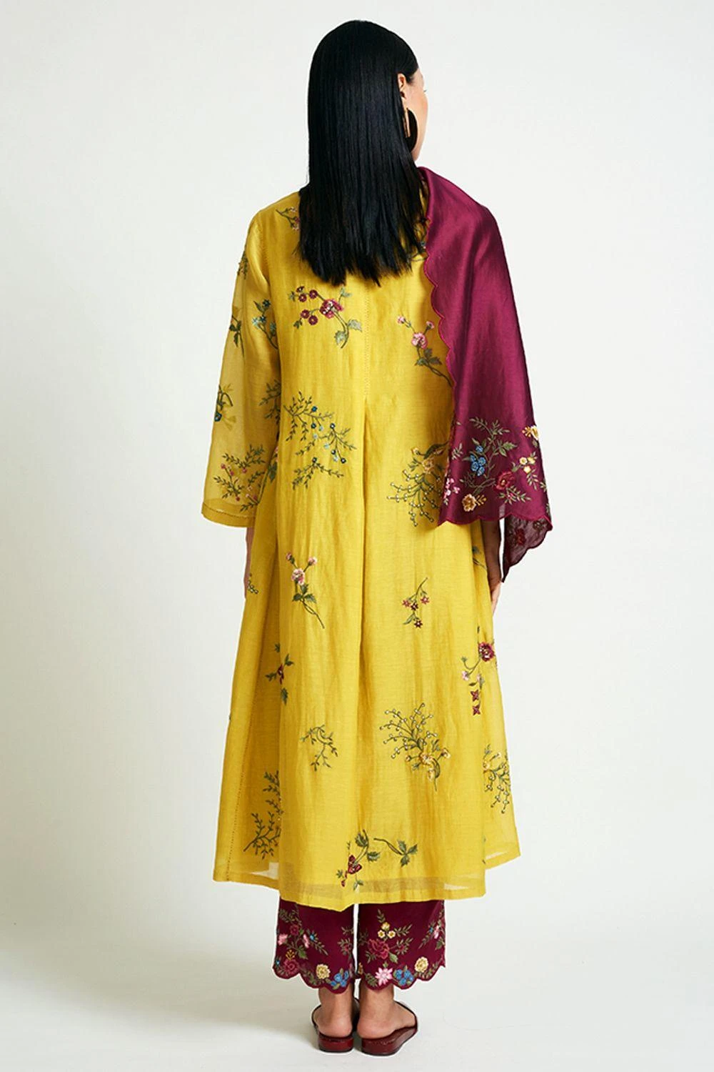 This maroon stole is woven in fine chanderi cotton silk and enhanced with placement embroidery & scalloped edges. It can be worn as a separate accessory or teamed up with a coordinating kurta set from the collection.