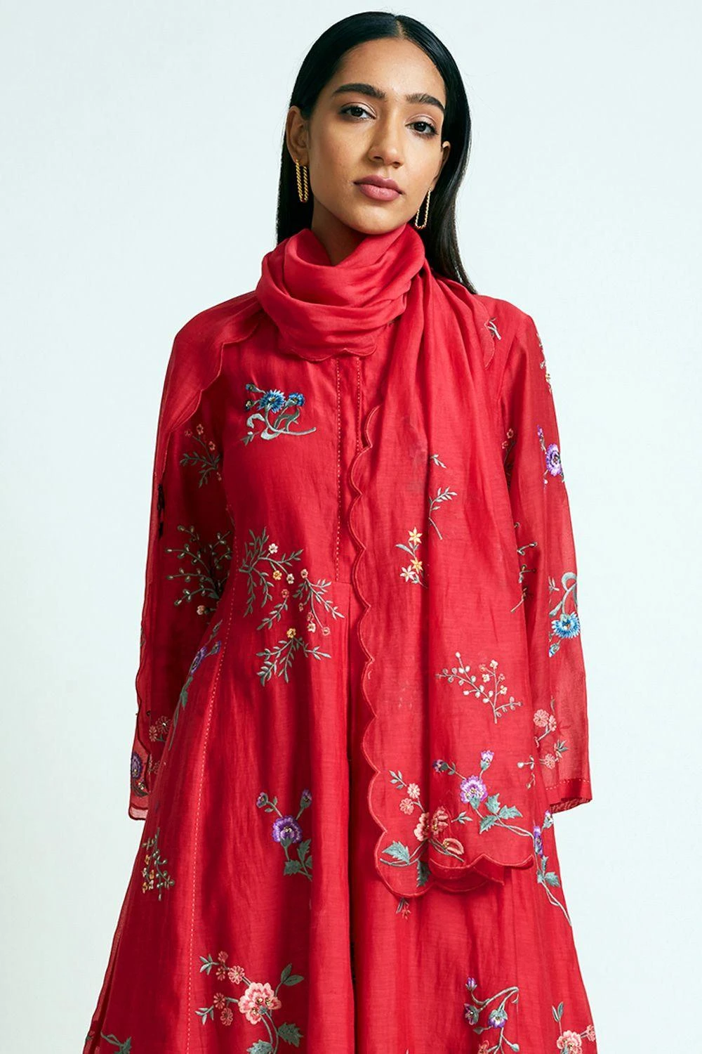 This red stole is woven in fine chanderi cotton silk and enhanced with placement embroidery & scalloped edges. It can be worn as a separate accessory or teamed up with a coordinating kurta set from the collection.