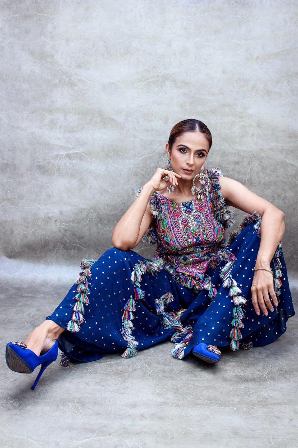 Contemporise your festive closet with this midnight blue sharara set. It features Payal Singhal’s signature backless choli with extensive bohemian embroidery and a mukaish georgette sharara.