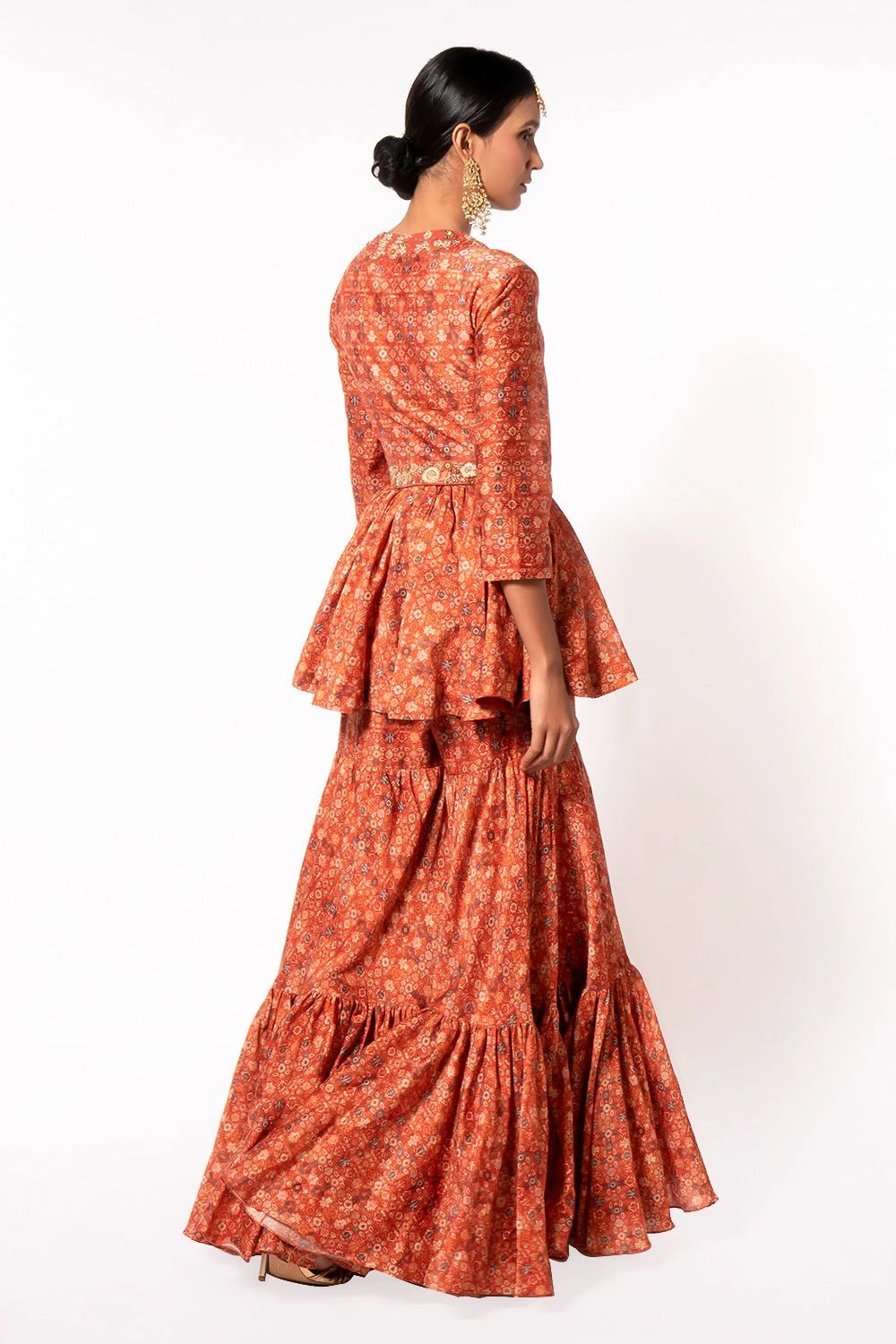 This elegant orange embroidered sharara set comes with a V-neck kurta, sharara & belt. This chic set can be styled with statement earrings & a clutch for daytime wedding festivities.