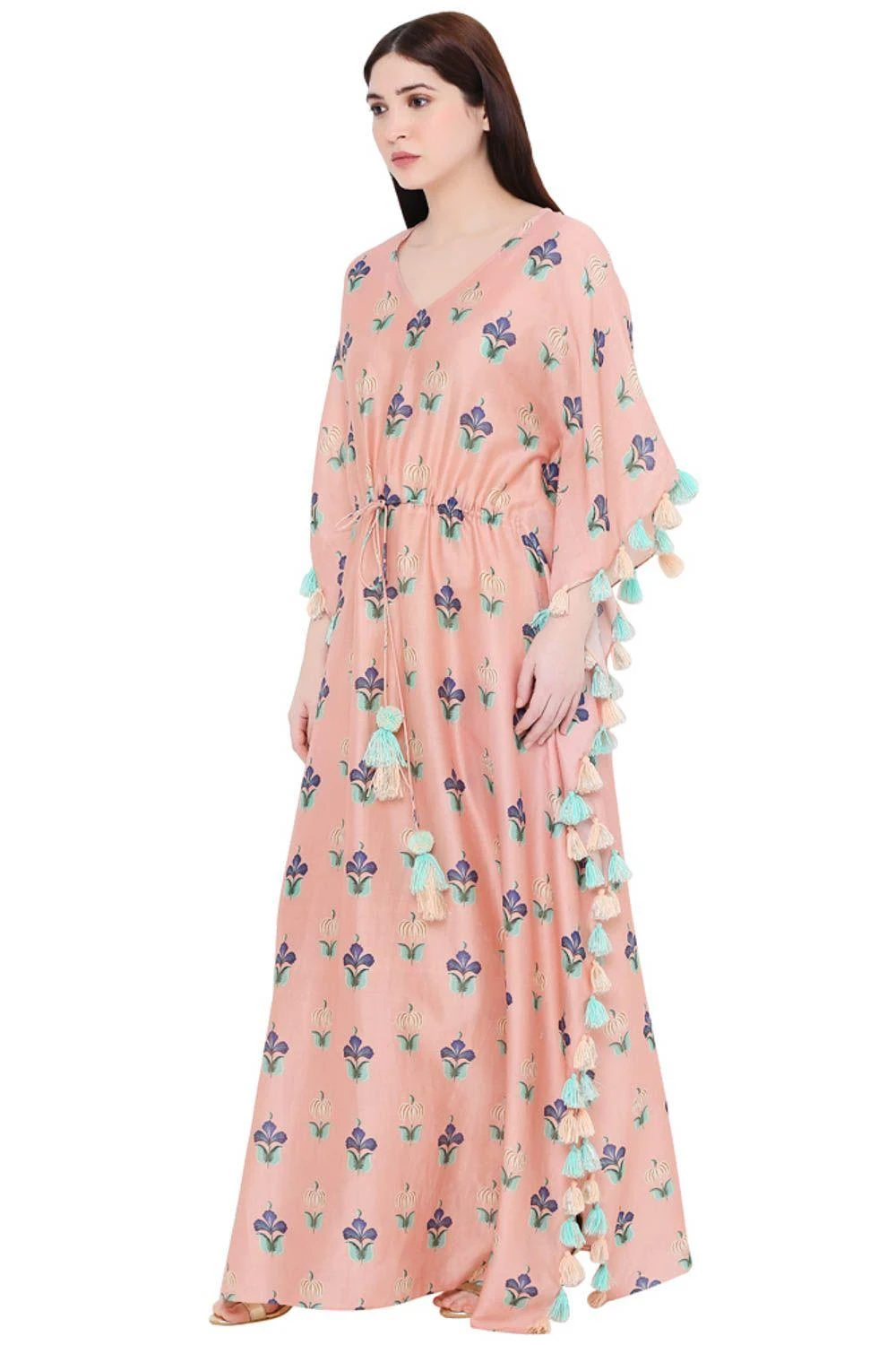 The perfect amalgamation of style & comfort, this kaftan is perfect for a day out. Crafted in silkmul, this kaftan features a butta print & colourful tassels all over. Style it with a pair of dangler earrings to complete the look.