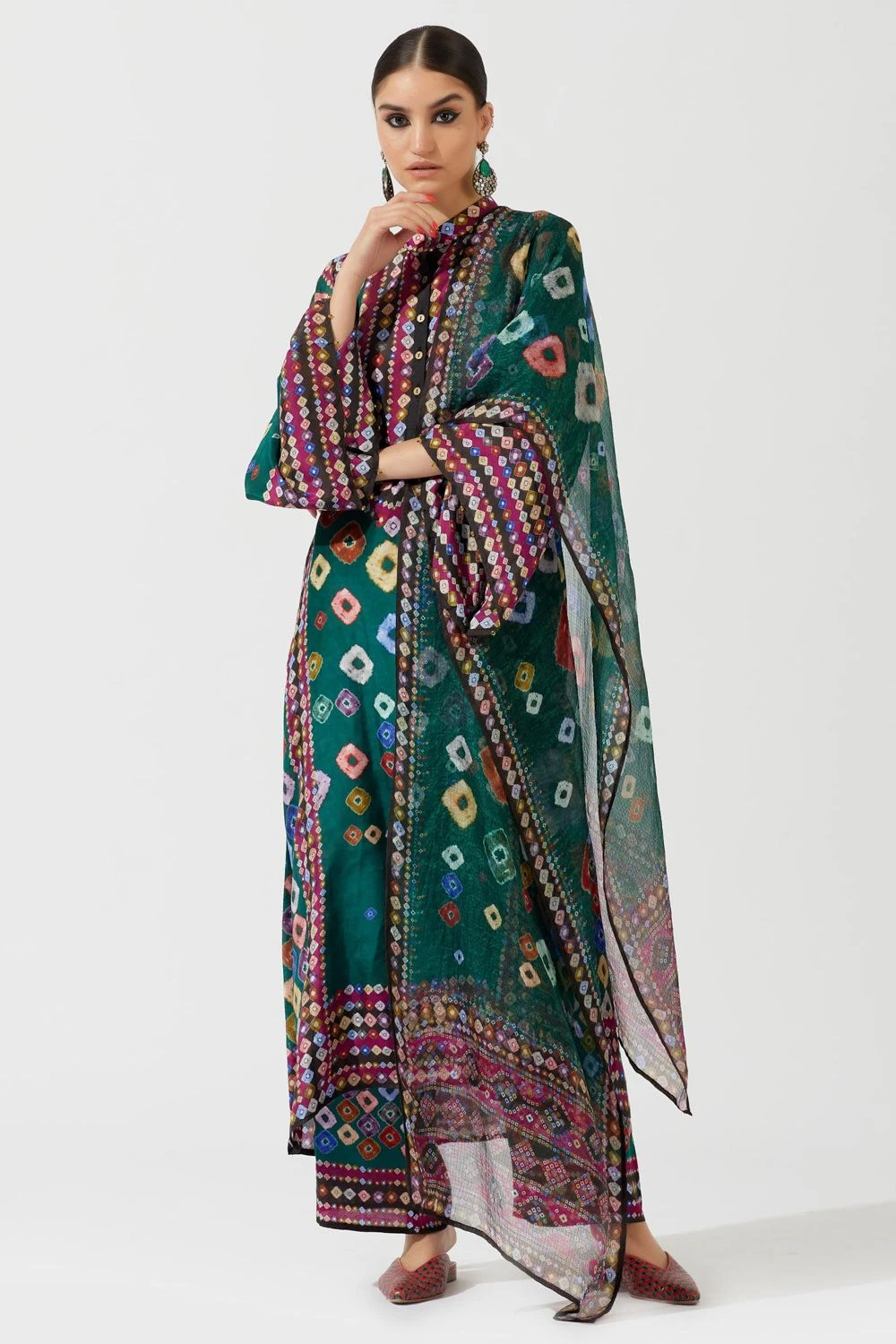 This elegant emerald green stole is set in a luxe kota silk fabric. The stole is covered in a geometric bandhani print. Style this piece with the matching set to complete the look.