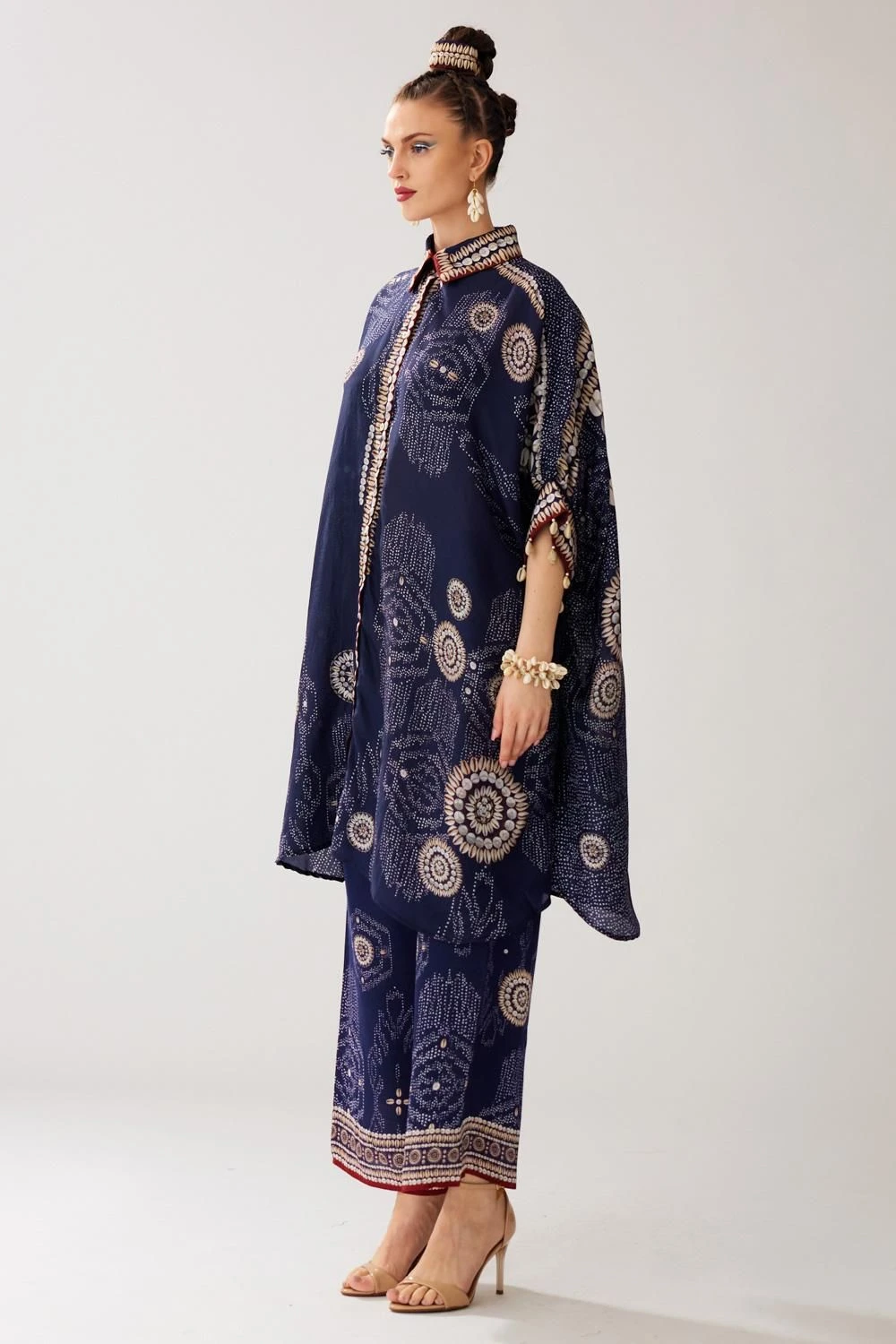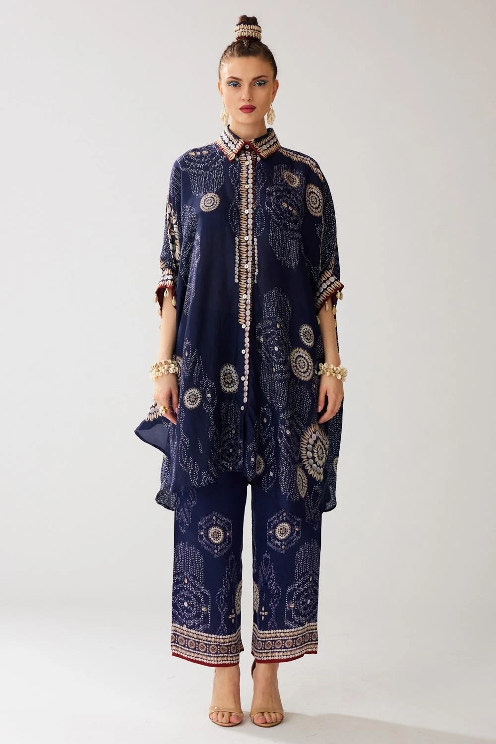 The perfect amalgamation of style and comfort, this tunic set works across occasions. Crafted in silk, set features a gathered sleeve tunic with a floral print & coordinating pants.