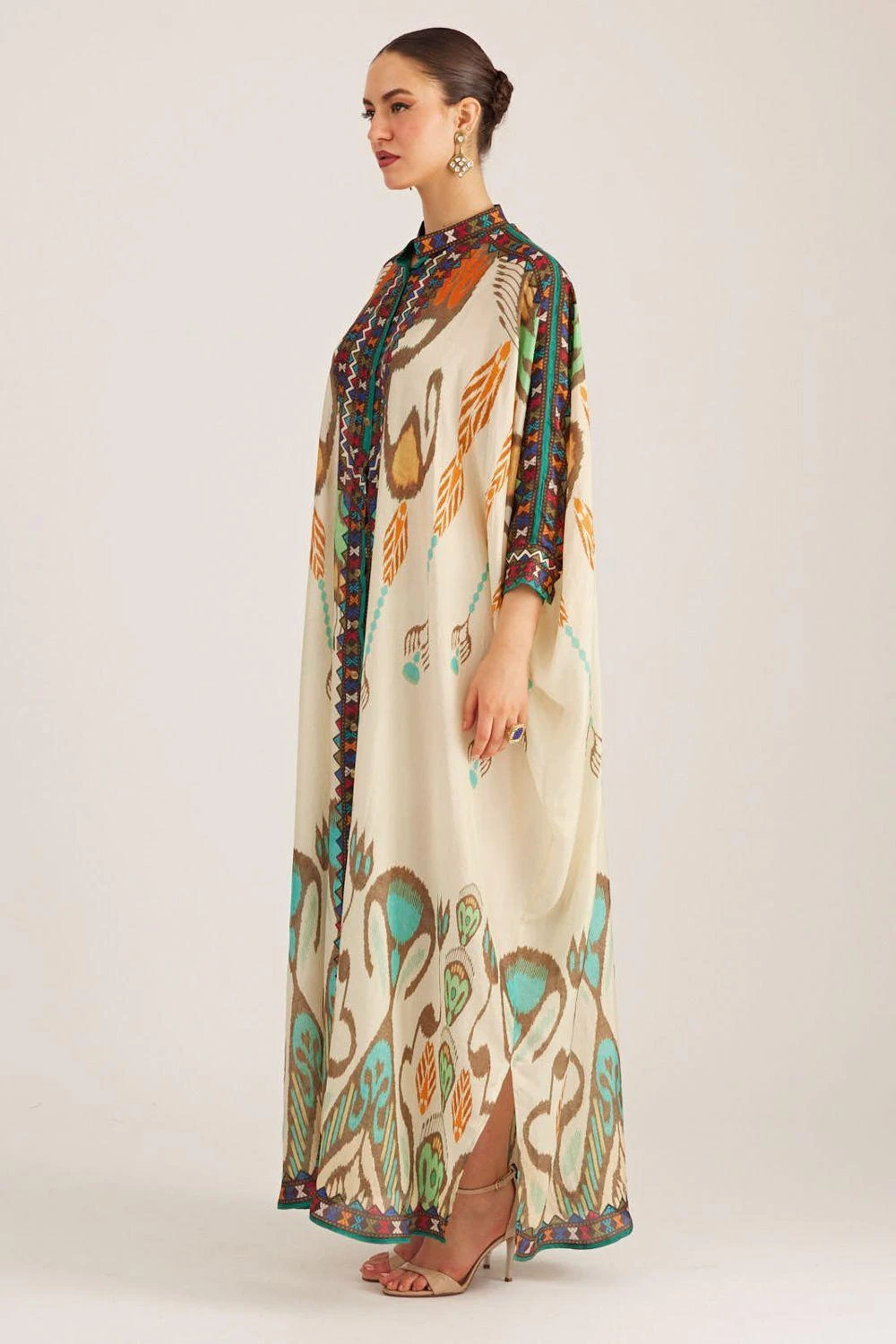 Step into style with this beige geometric print silk kaftan. Adorned with a front button placket & cuffs, it is ideal for resort wear. Pair up with sandals for a relaxed vibe or heels for an elegant evening look. Effortless style for any occasion!