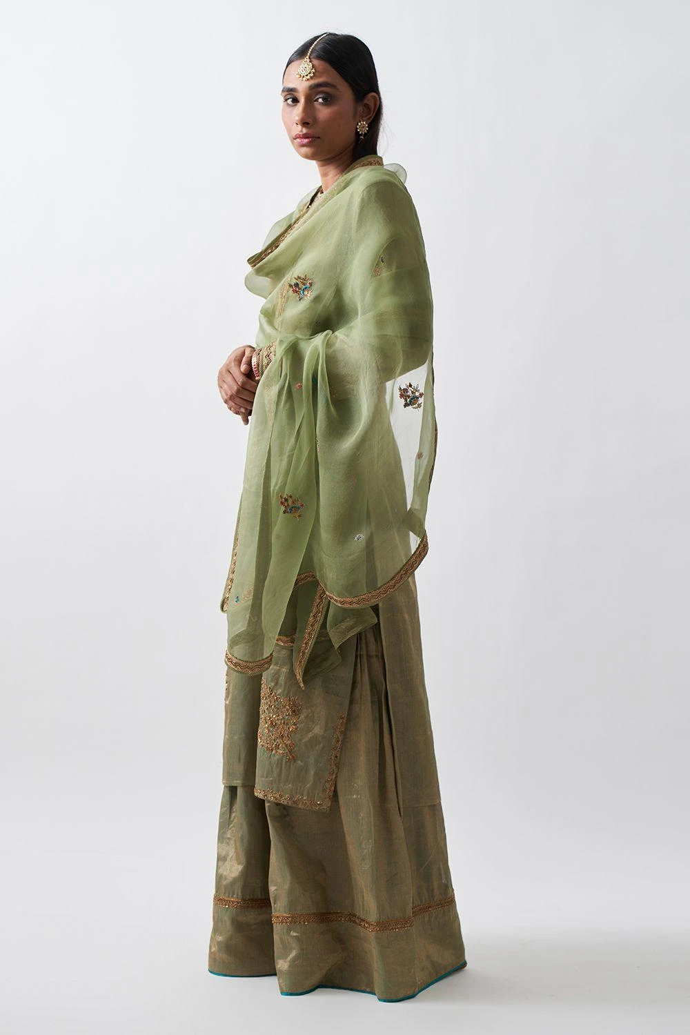 Add a regal aesthetic to your wardrobe with this green pistachio sharara set. It features a kurta, sharara and dupatta in antique gold ari-zardozi embroidery. Style this set with a pair of statement earrings, heels & a potli bag to complete the look.