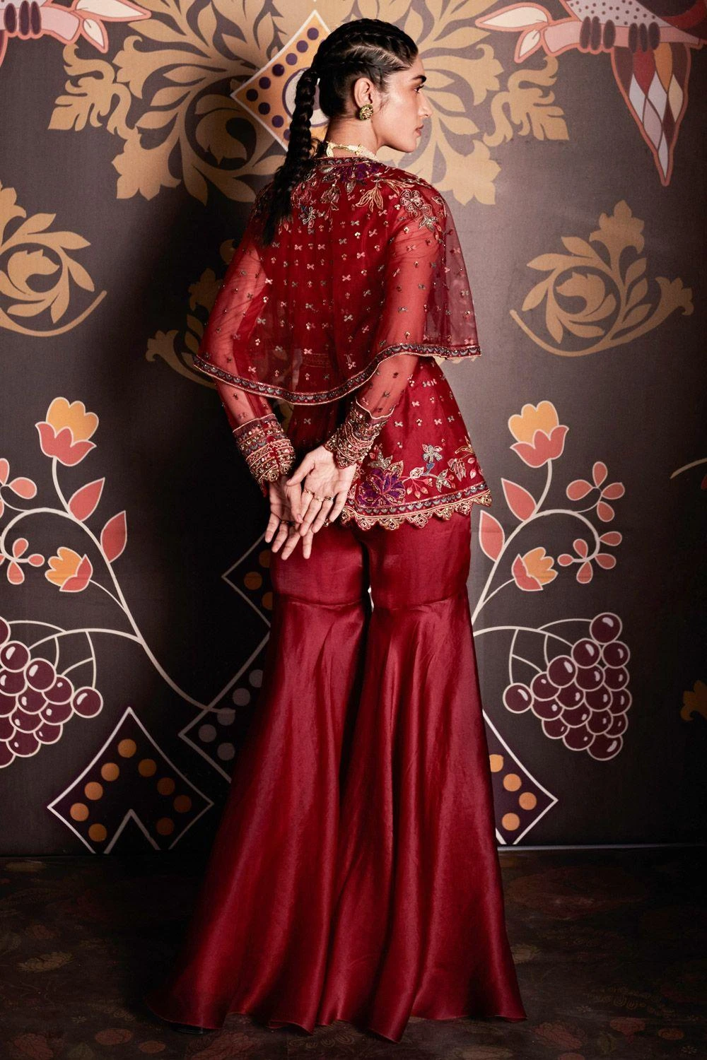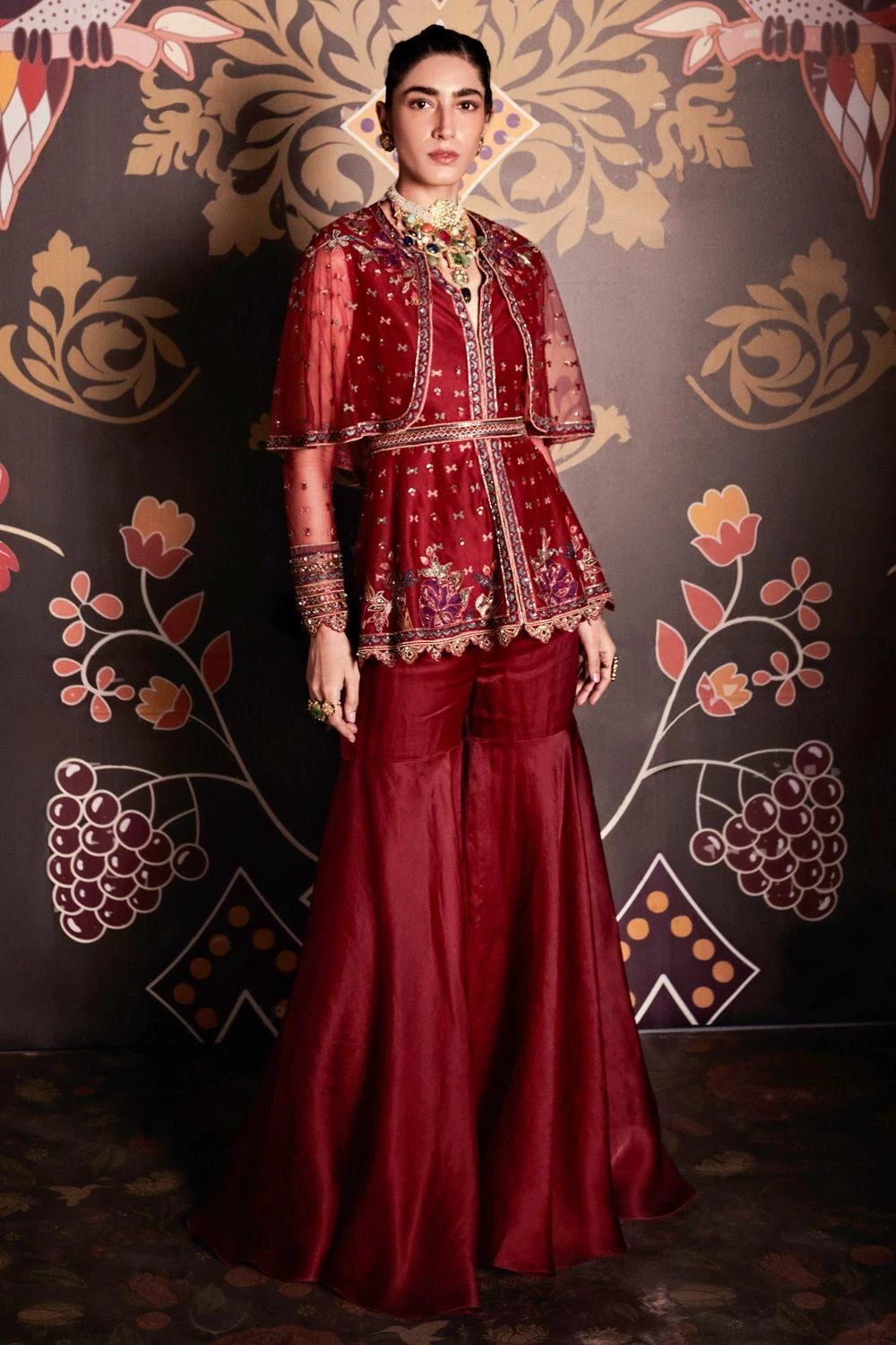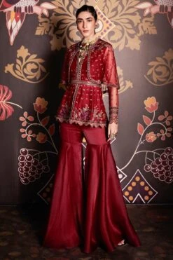 This burgundy embroidered net cape, peplum & organza sharara is perfect for evening time festivities. Style this chic set with statement diamond earrings & a clutch to complete the look.